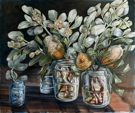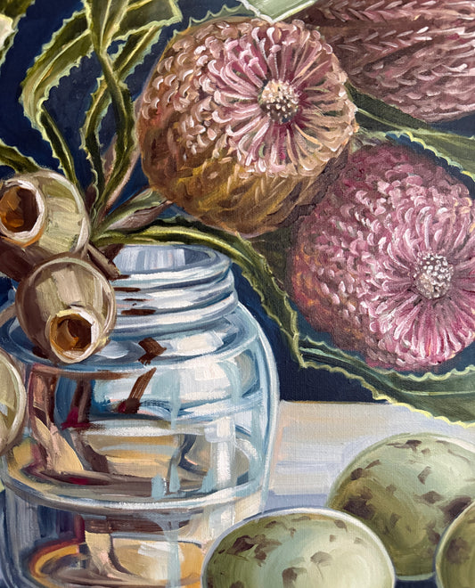 “The objects [I paint] are from op shops or my own collections. I am big on collecting vintage fabrics, so I often start with the fabrics. Next, I add vases and flowers that are in season. It is less about the botanical painting, more about the sculptural composition."