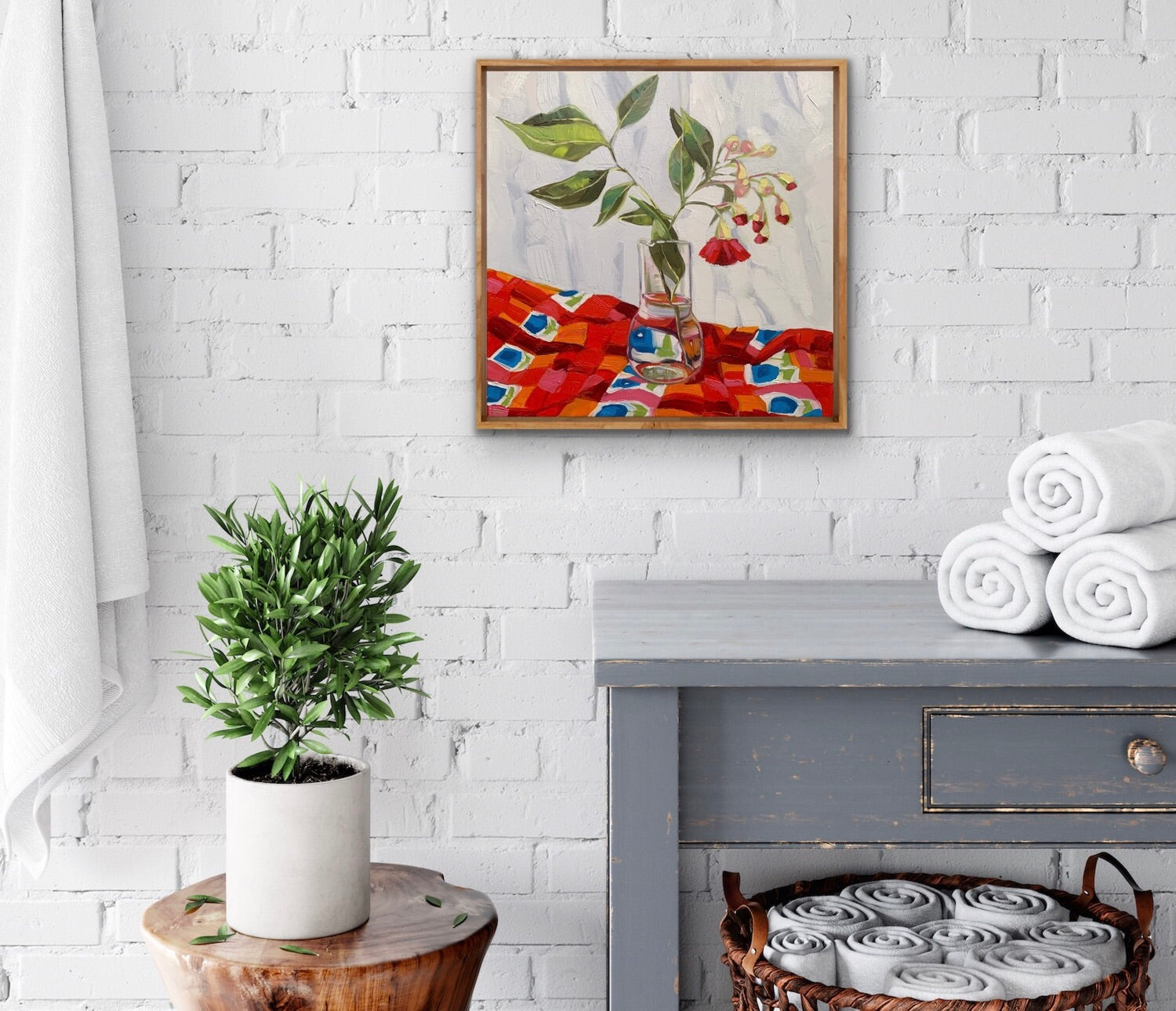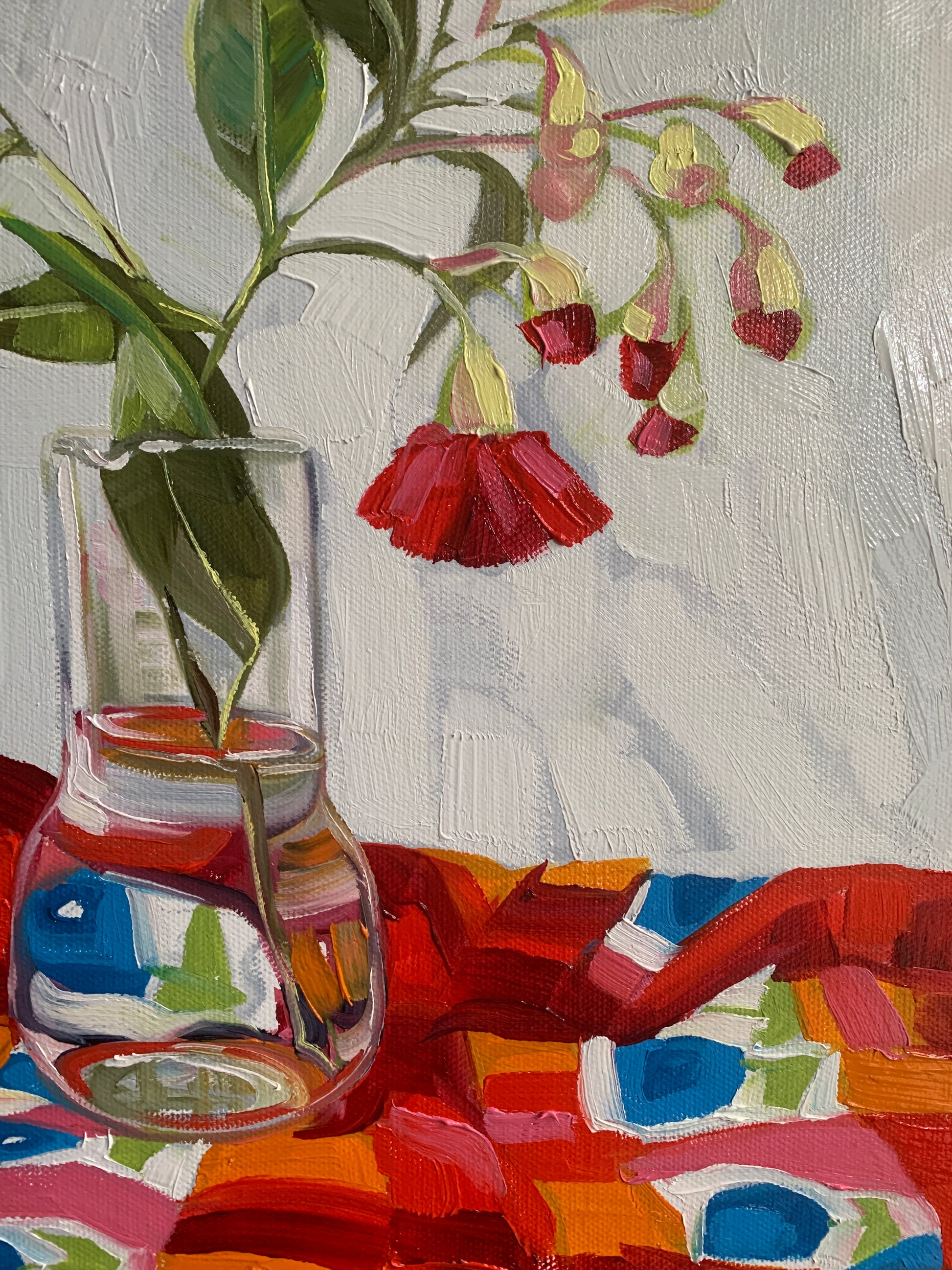 A study of some gorgeous red gum blossom placed in a favourite vintage Apron from the 70's