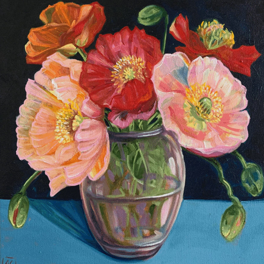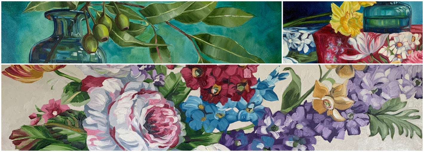 “The objects [I paint] are from op shops or my own collections. I am big on collecting vintage fabrics, so I often start with the fabrics. Next, I add vases and flowers that are in season. It is less about the botanical painting, more about the sculptural composition."