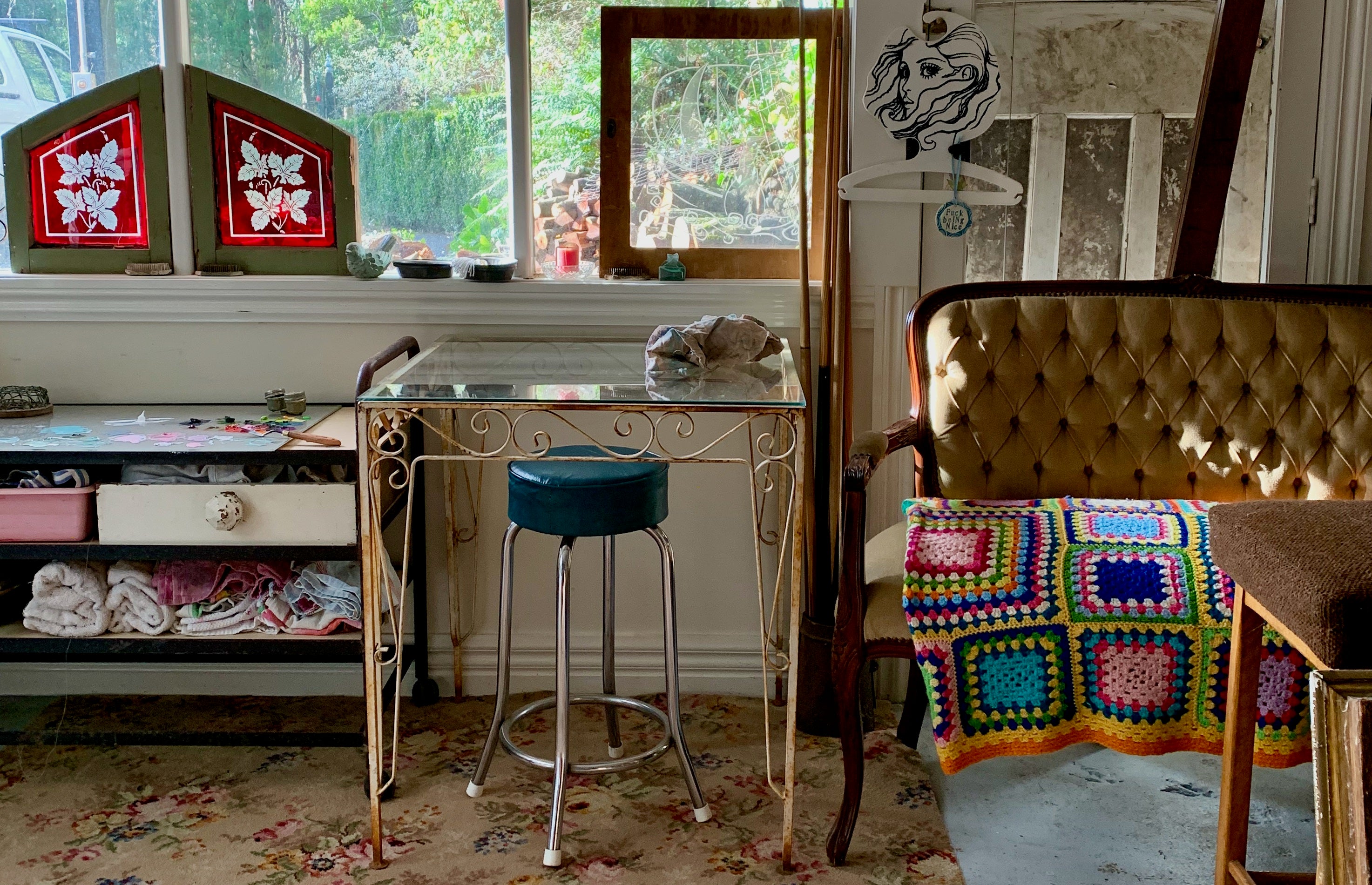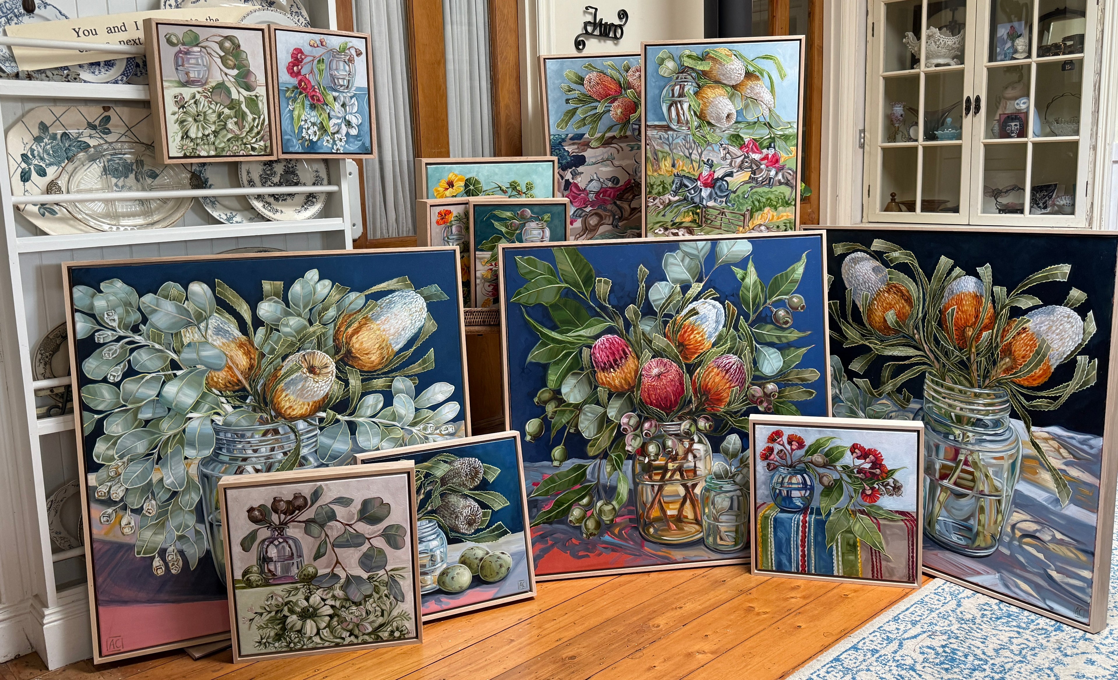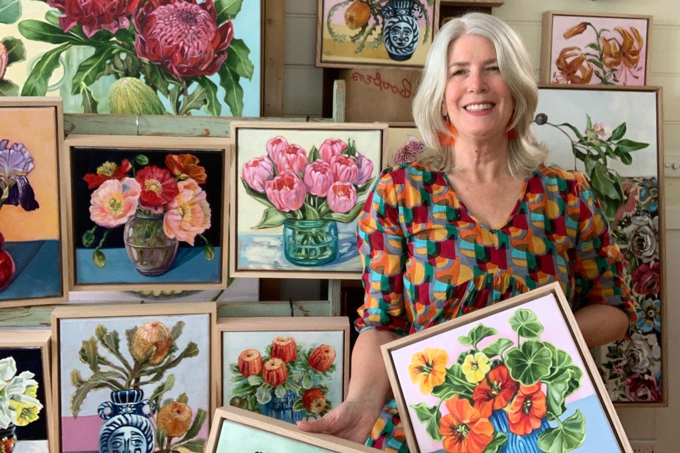 Alicia Cornwell paints in her studio in a 100-year-old home on top of a mountain in Olinda, Victoria, Australia. She is a visual artist painting still lives of her surroundings; the big gardens with the local flora, the vintage treasures she has collected over the years and striking fabrics from the early twentieth century