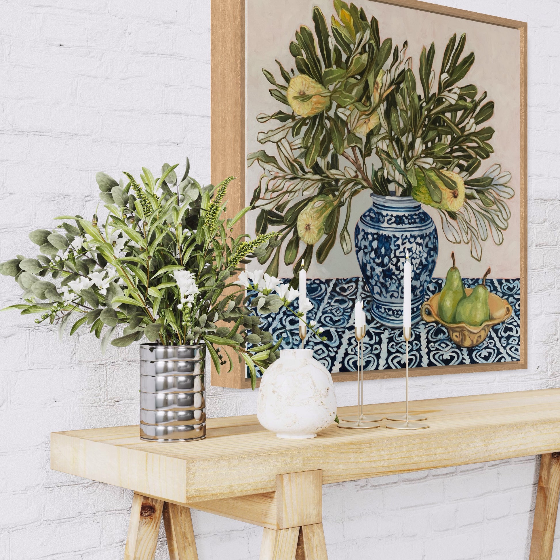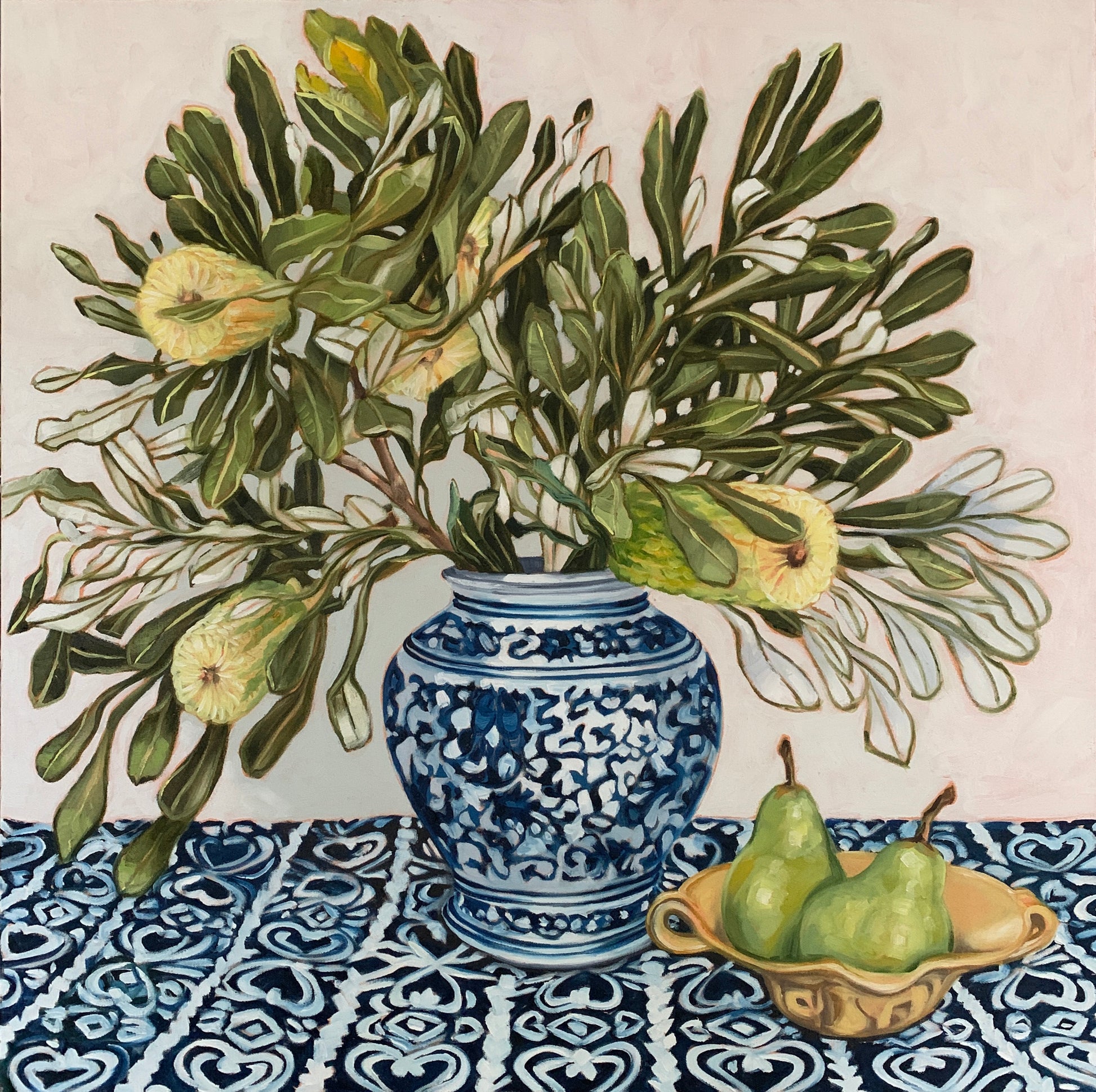Coastal Banksia with pears in a Tuscan olive bowl on a blue and white tablecloth.