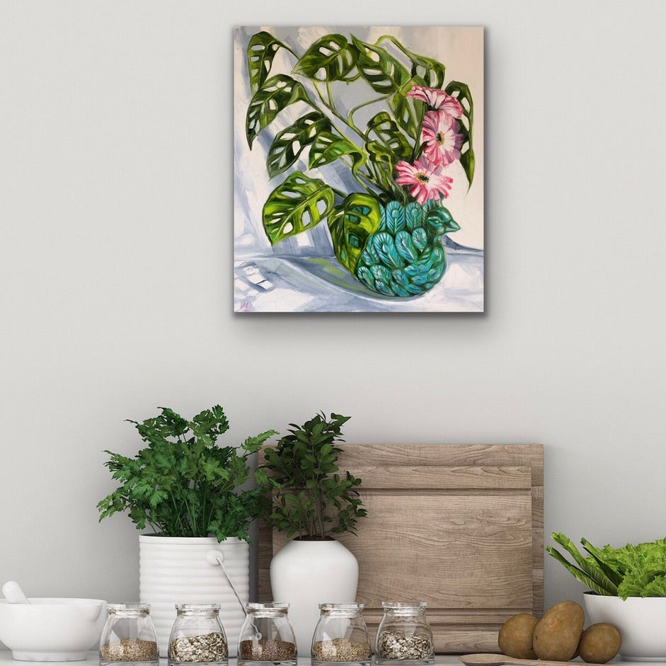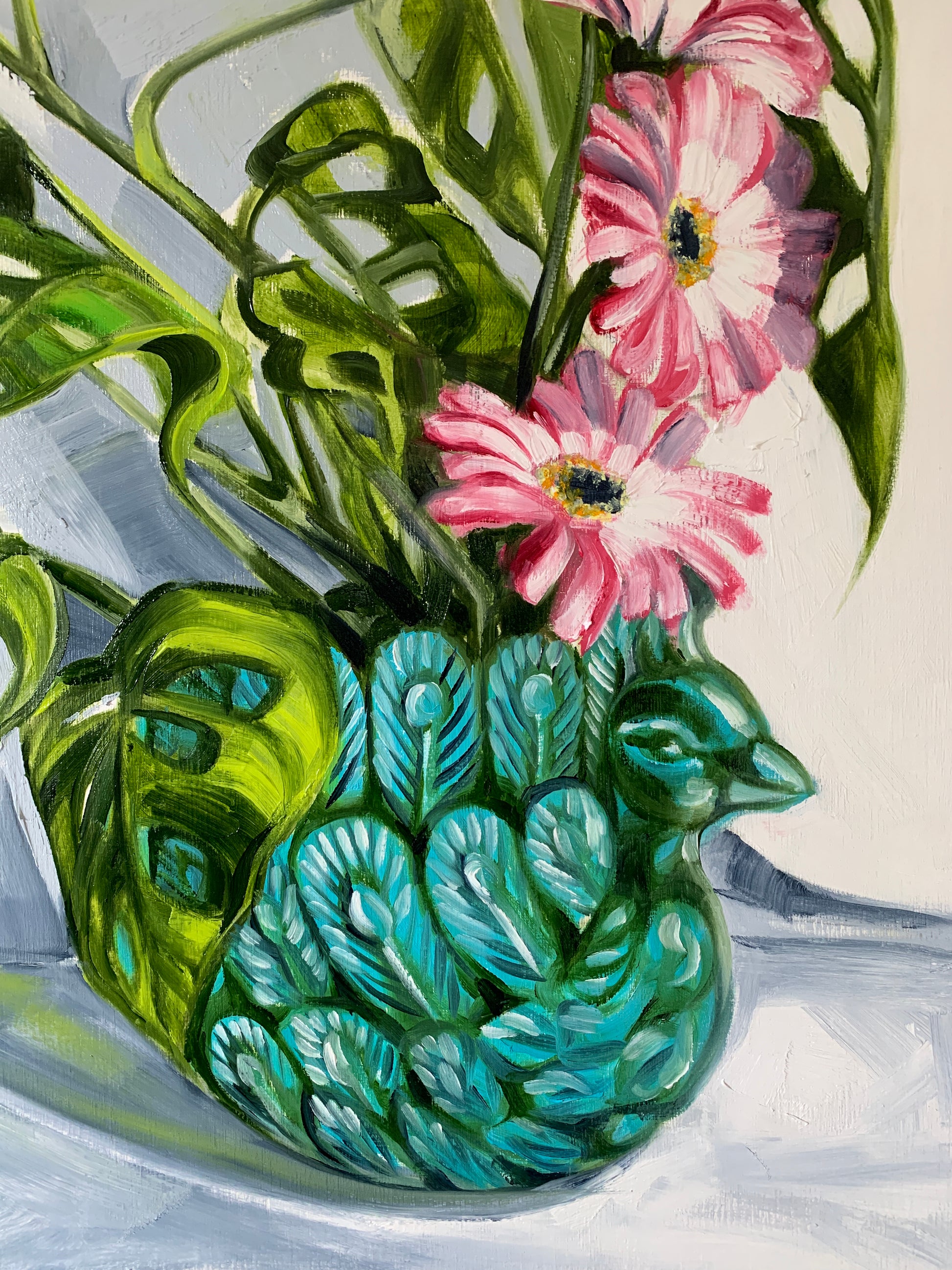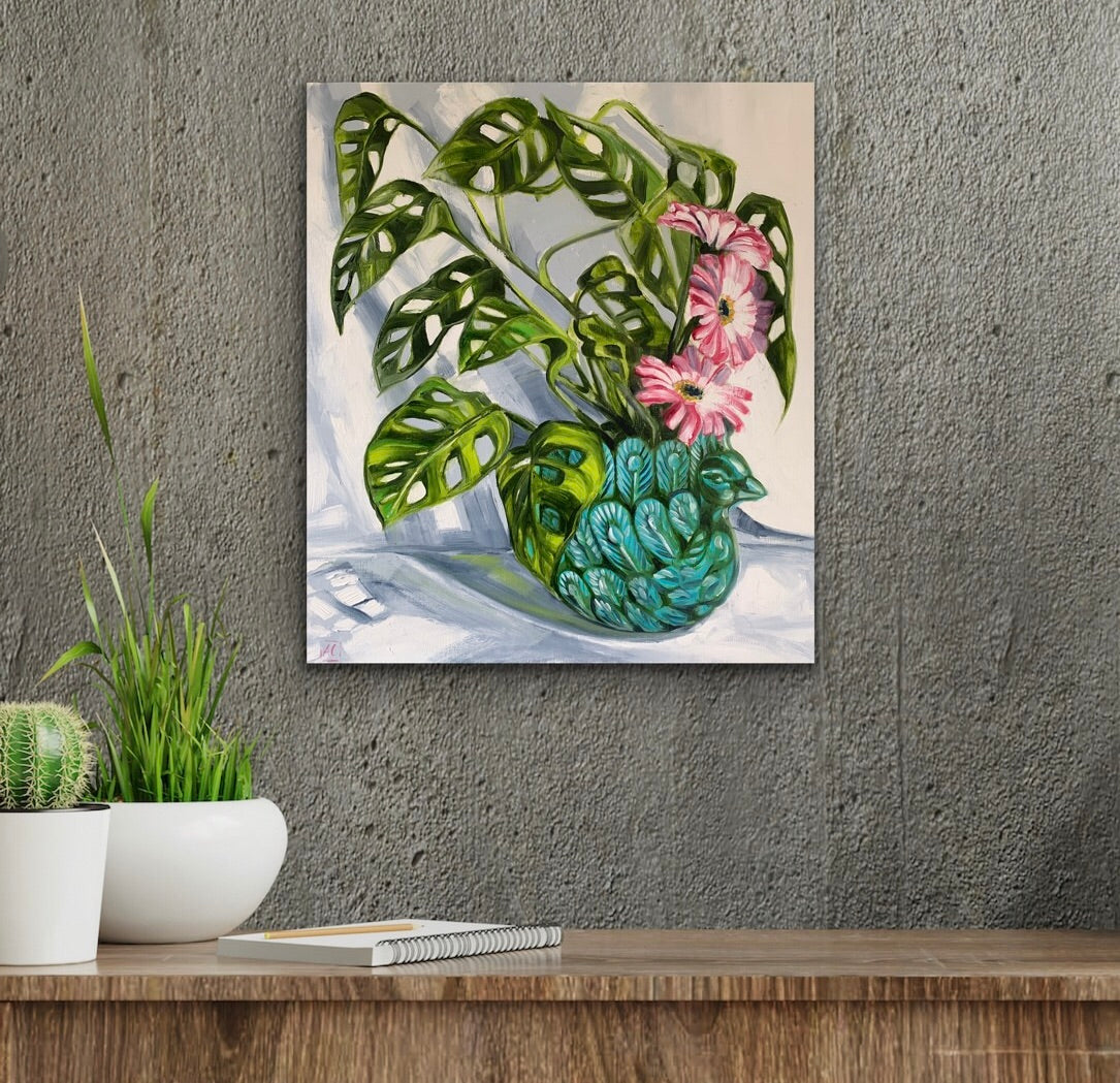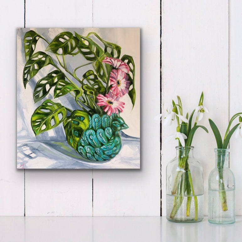 One of my favourite indoor plants sitting in a peacock planter with a pop of pink gerberras