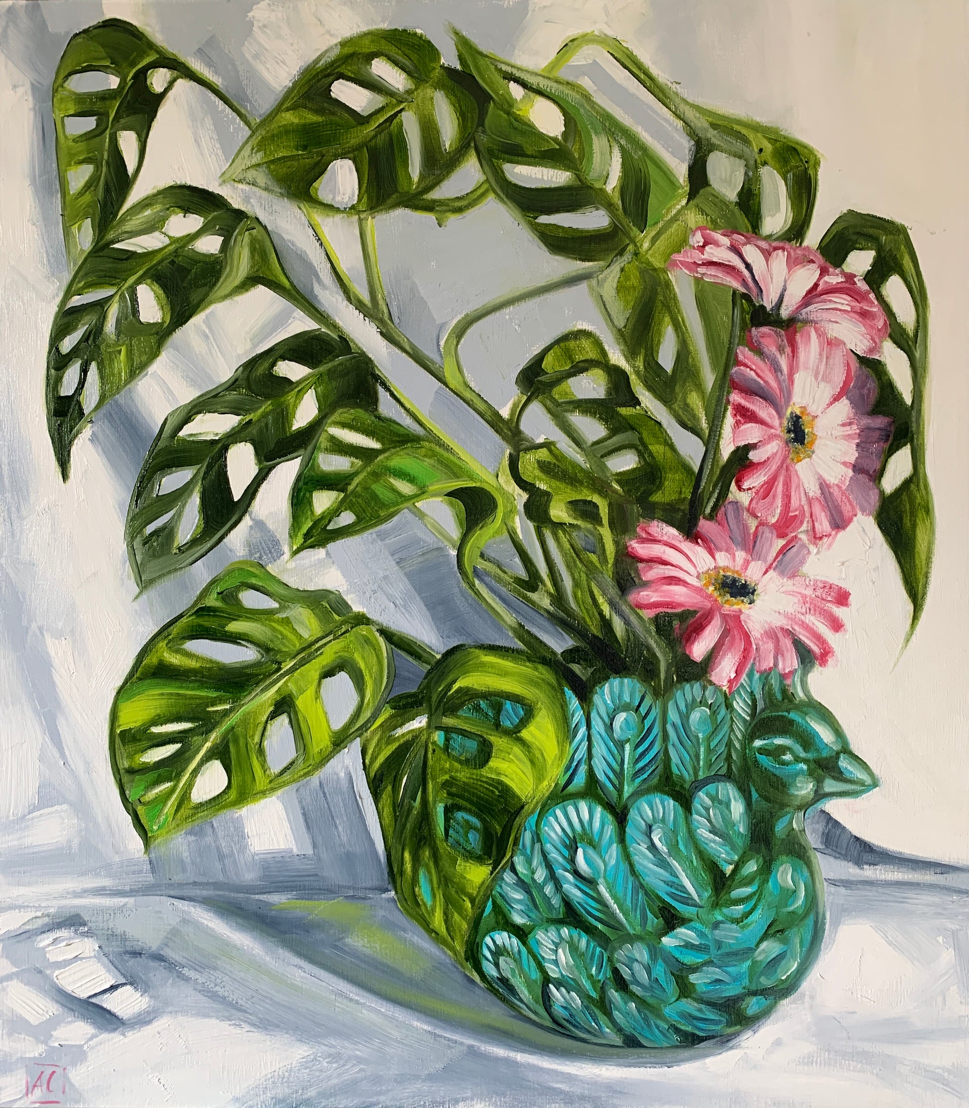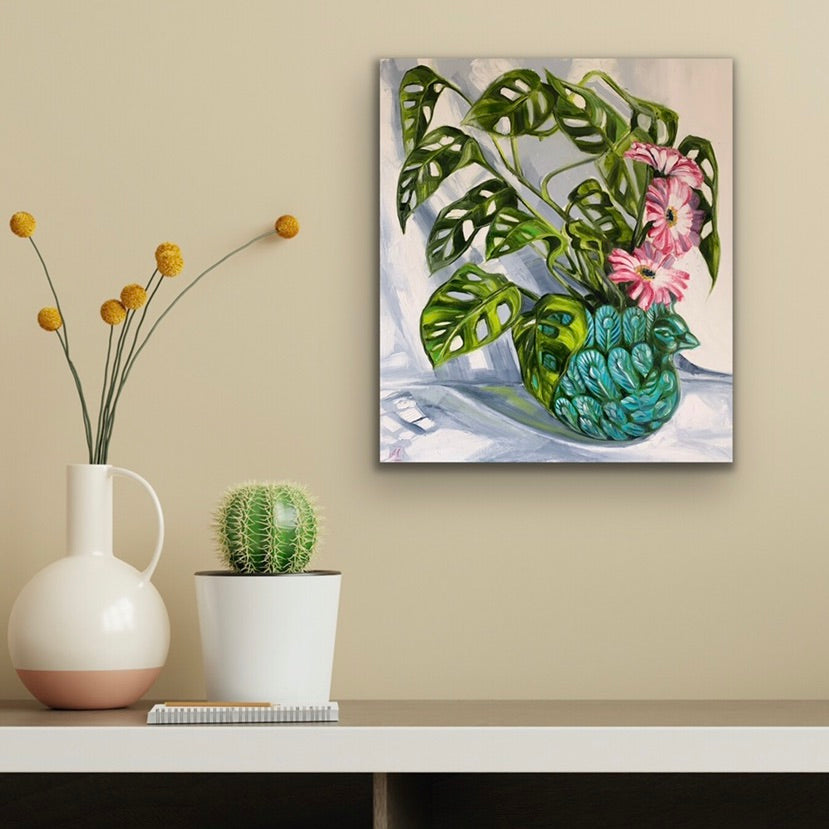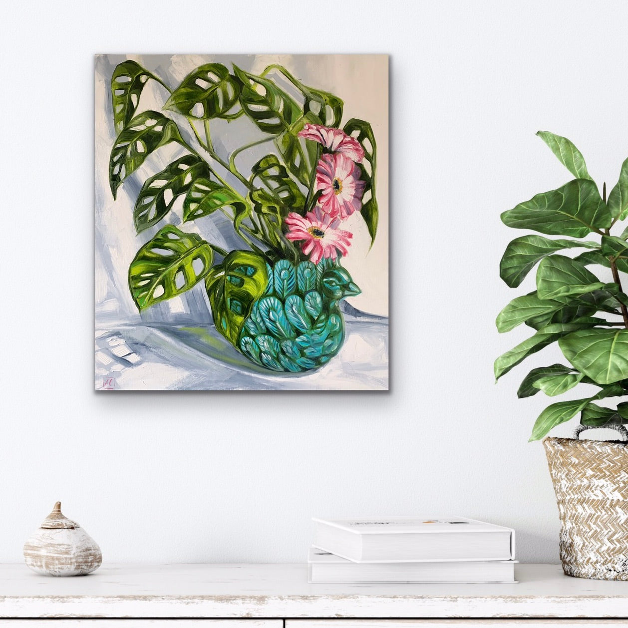 One of my favourite indoor plants sitting in a peacock planter with a pop of pink gerberras