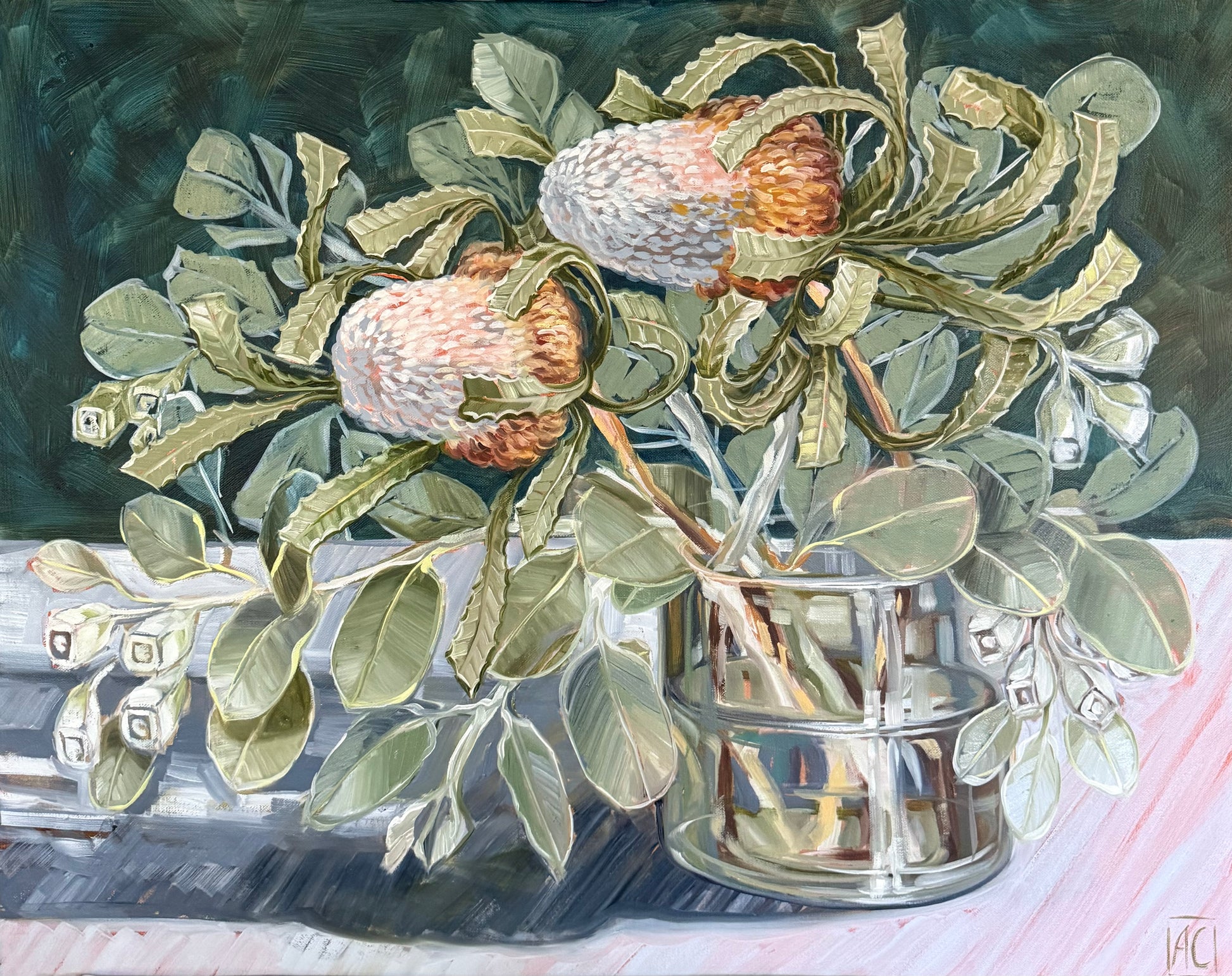 STATEMENT - For me, the Australian bush is a sacred sanctuary—a living, breathing church where I feel most spiritually connected and deeply grounded. In this work, I seek to express that profound reverence and the quiet holiness I experience when surrounded by native flora. The bush offers more than beauty; it offers stillness, healing, and communion. This work is a painted prayer, a meditation on breath, spirit, and light. The glass jar, both vessel and reliquary, holds not just stems but presence—capturing flickers of something greater, intangible, and timeless. The leaves and flowers are my hymns, and the play of light and shadow is the stained glass of this natural cathedral. Through layered brushwork and rich textures, I invite the viewer into my place of worship, to witness the sacred rhythms of the land and to feel, if only for a moment, the breath of the bush spirits.