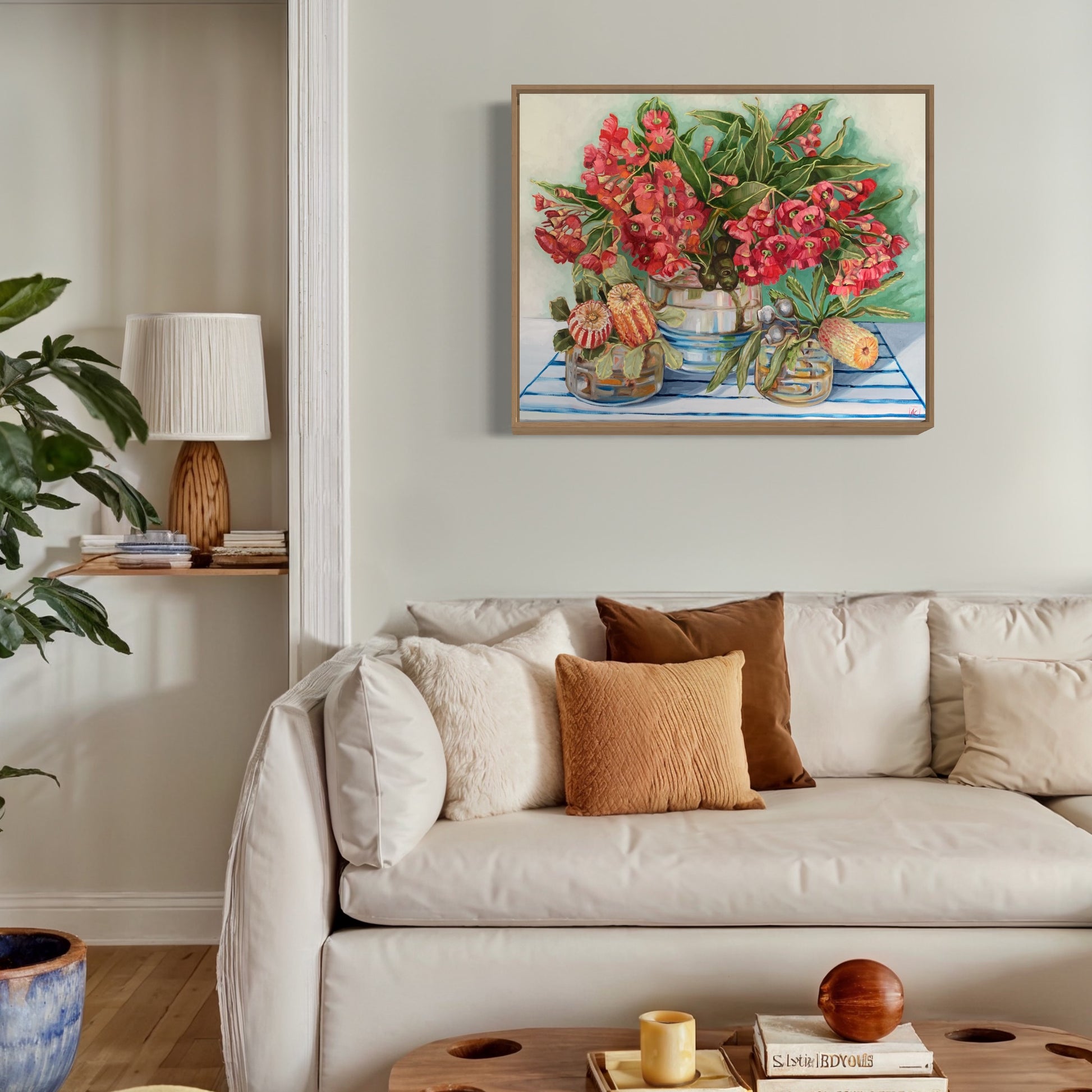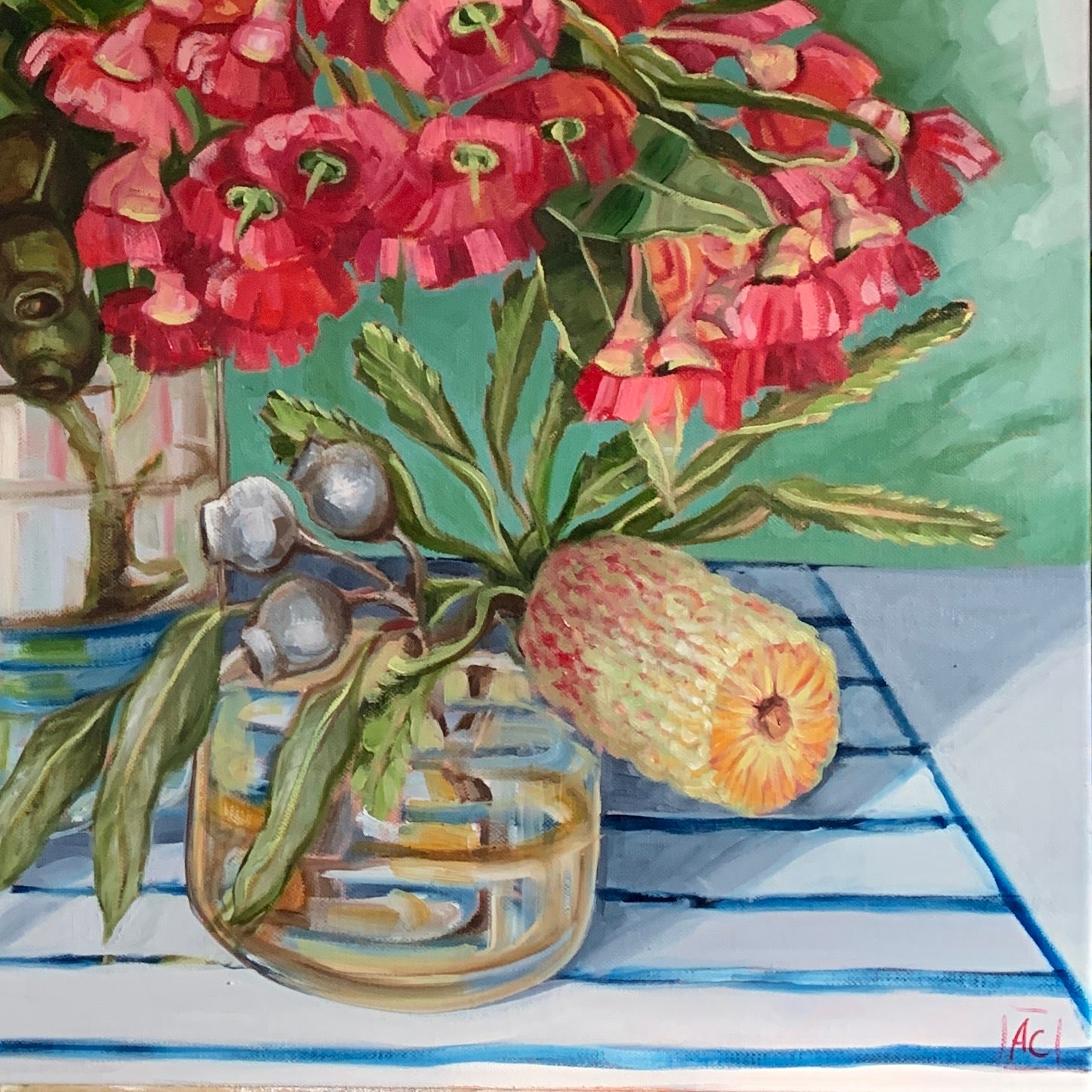 A large found bunch of gum blossom with native banksia in glass vases on a striped cloth