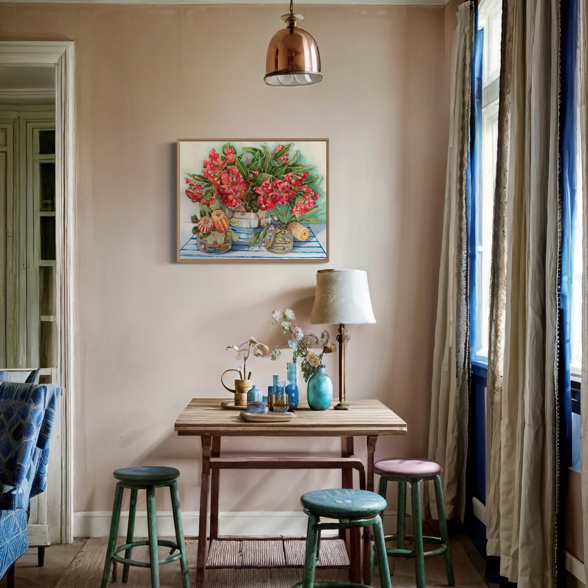 - This painting is on ARTIST quality stretched cotton duck canvas with internal wooden frame and Raw Oak external frame.