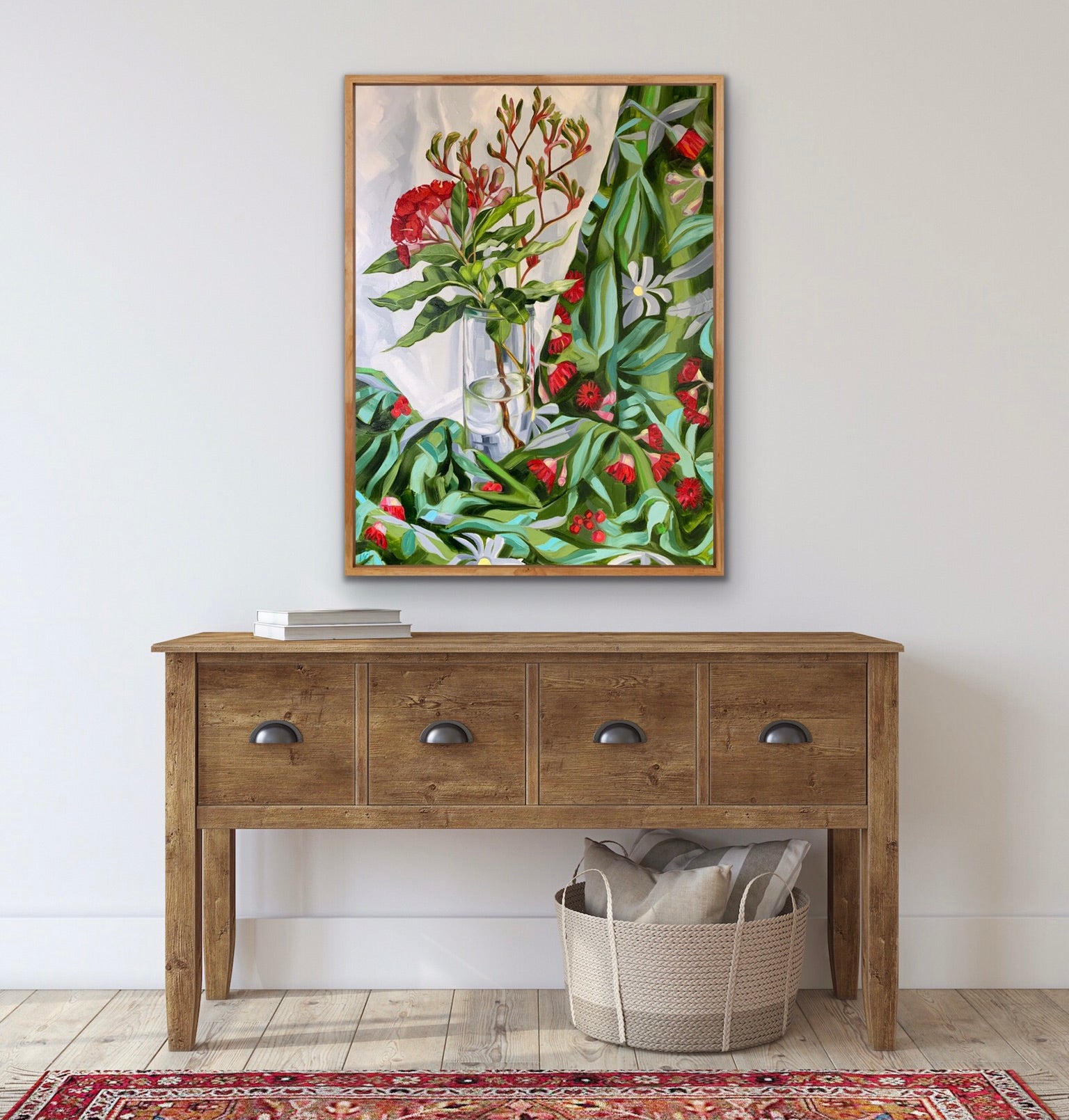 Placed in a 1930's tall Fowlers Bottling jar on a swathe of Australiana Fabric.