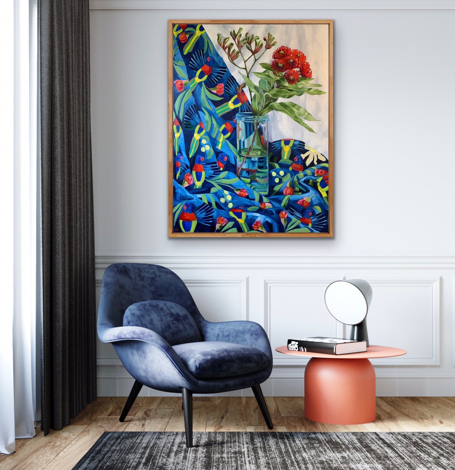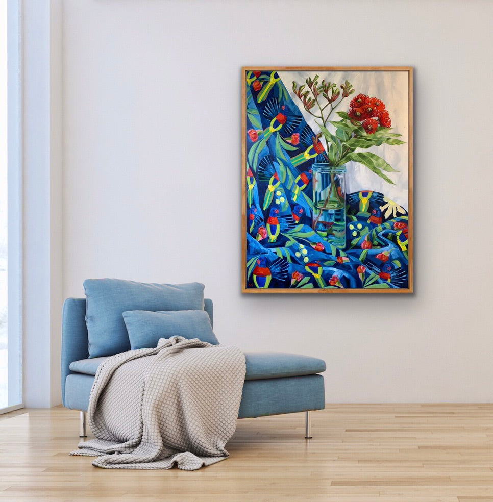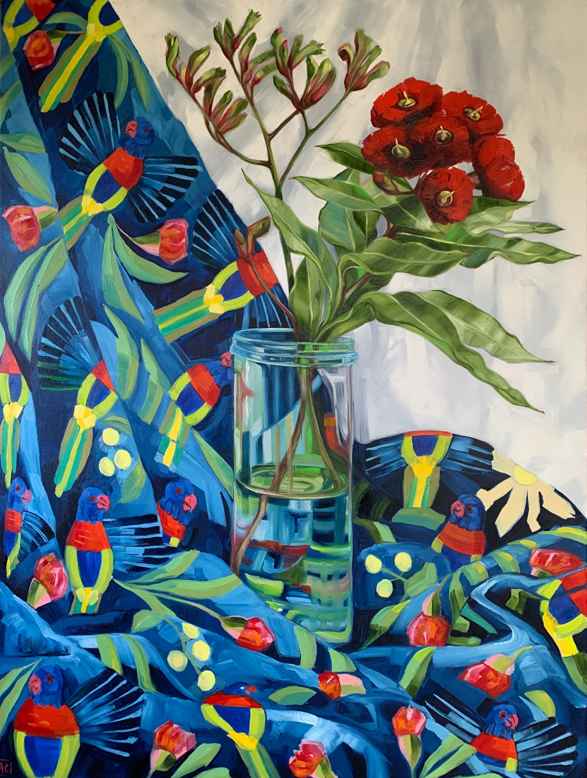 Placed in a 1930's tall Fowlers Bottling jar on a swathe of Australiana Fabric.