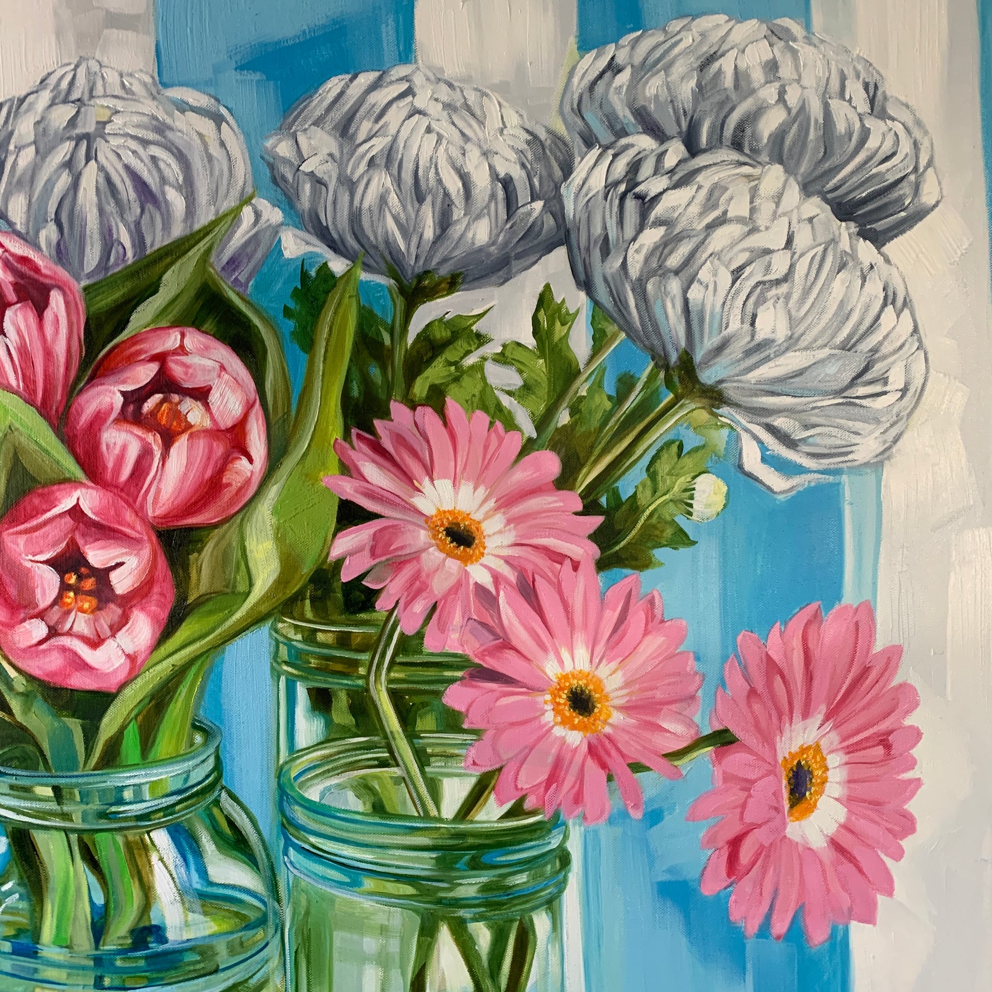 Behind a froth of White Chrysanthemum in a tall thick glass Vintage Fowlers bottling jar. Gerberas add a pop of pink sourced from the same local flower farm sitting in another squat Fowlers bottling jar.