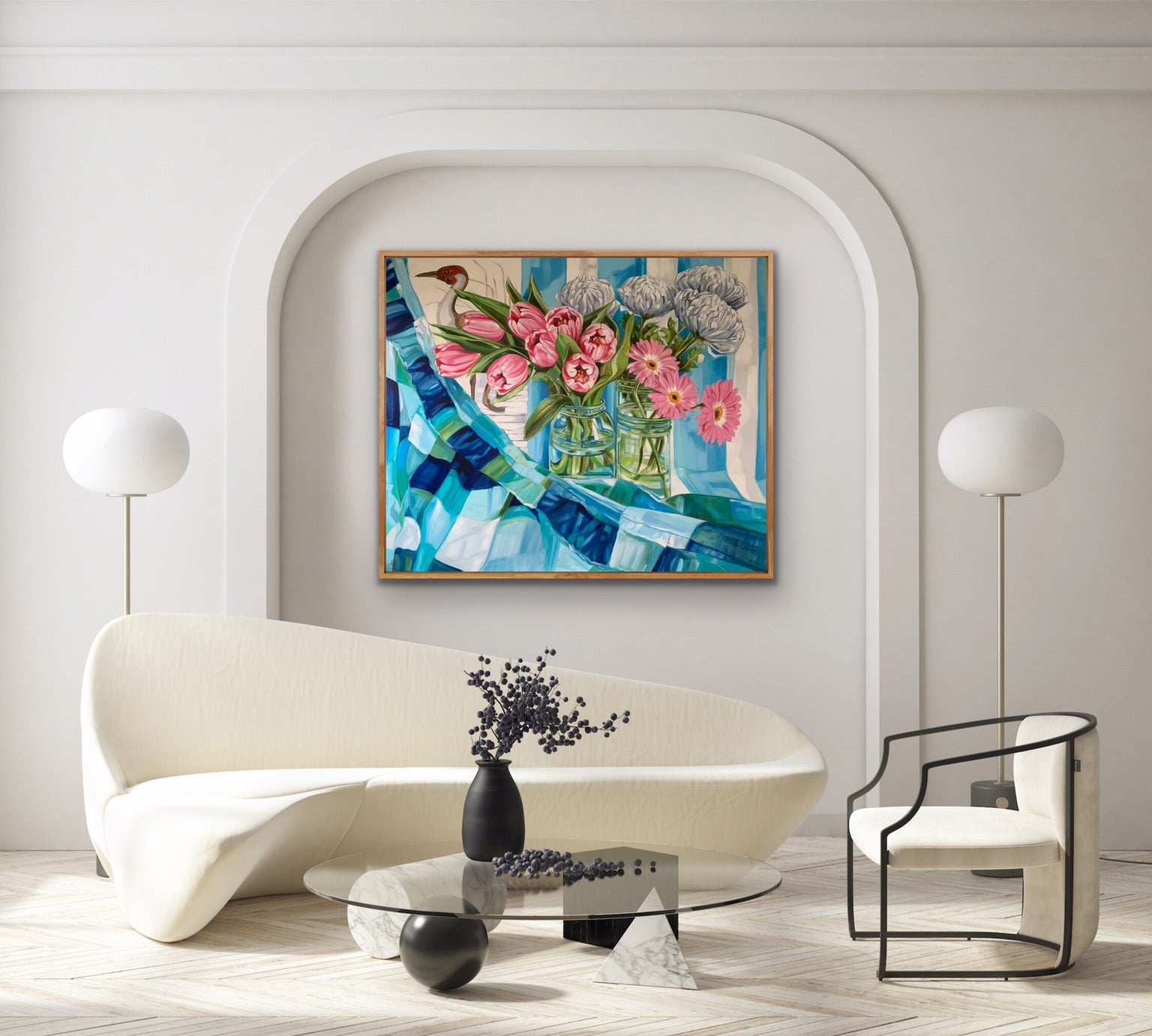 A peek from an early Vintage glass tray features a tall Heron bringing height to the composition and leading the eye back to the downward swoosh of the fabric in front.