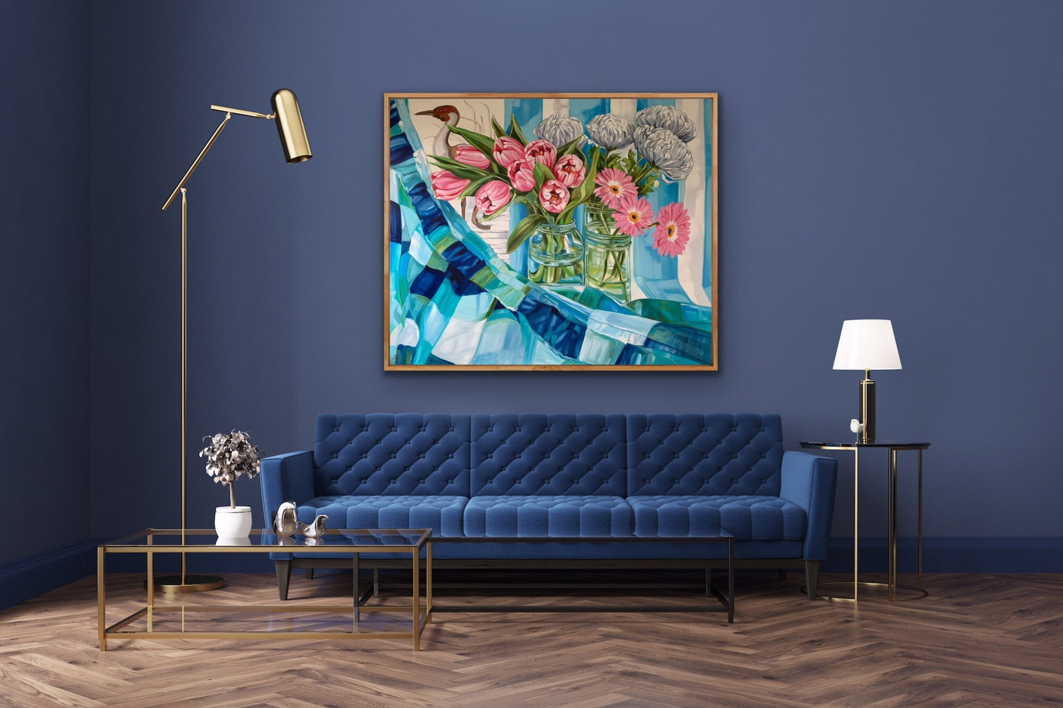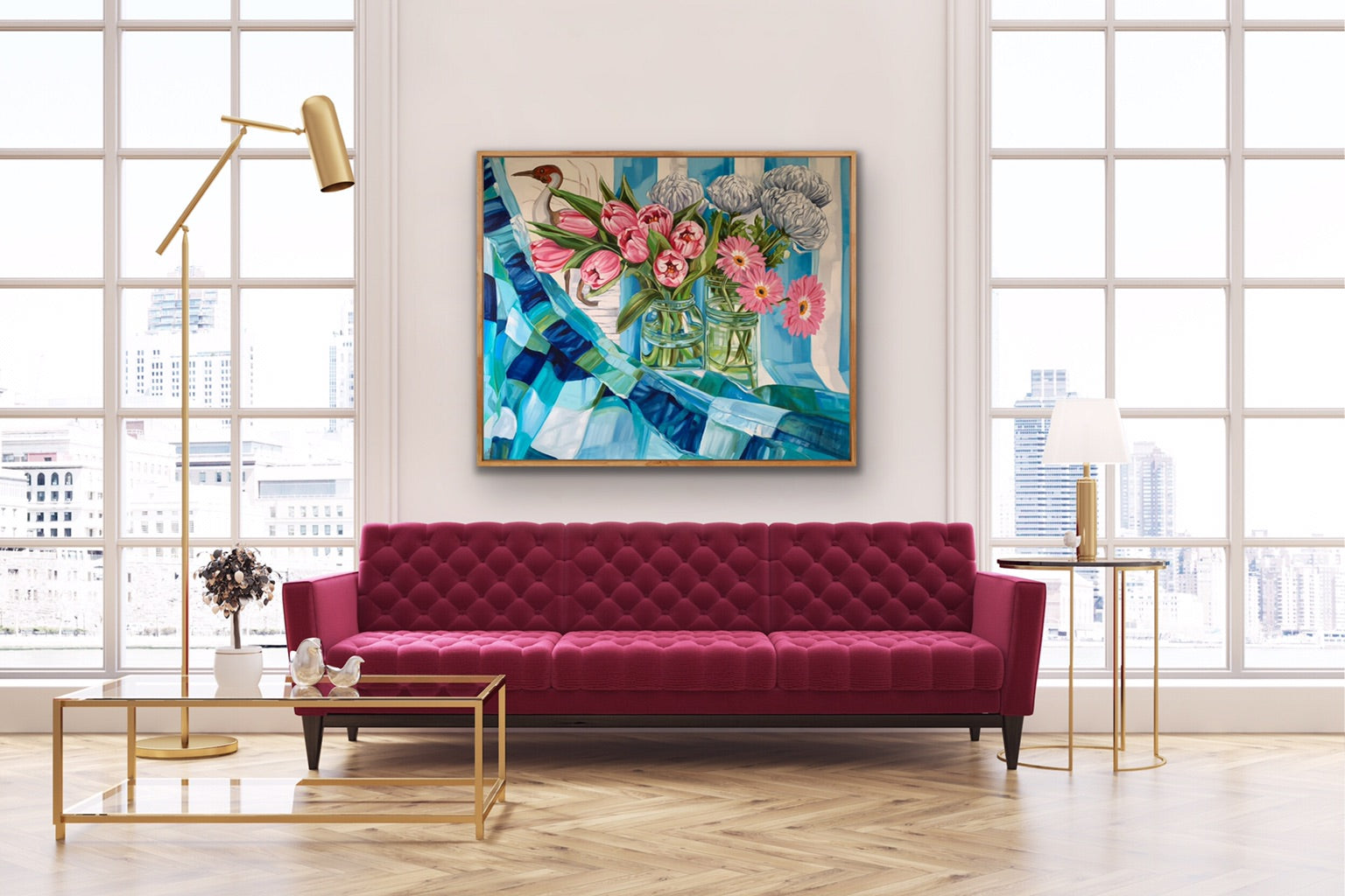 My current body of Still Life works are considered vignettes that are set up to lead the eye across the canvas. I allow this flow to happen with both organic and found forms, a mix of my vintage fabric collections with flora that is grown locally to my studio.