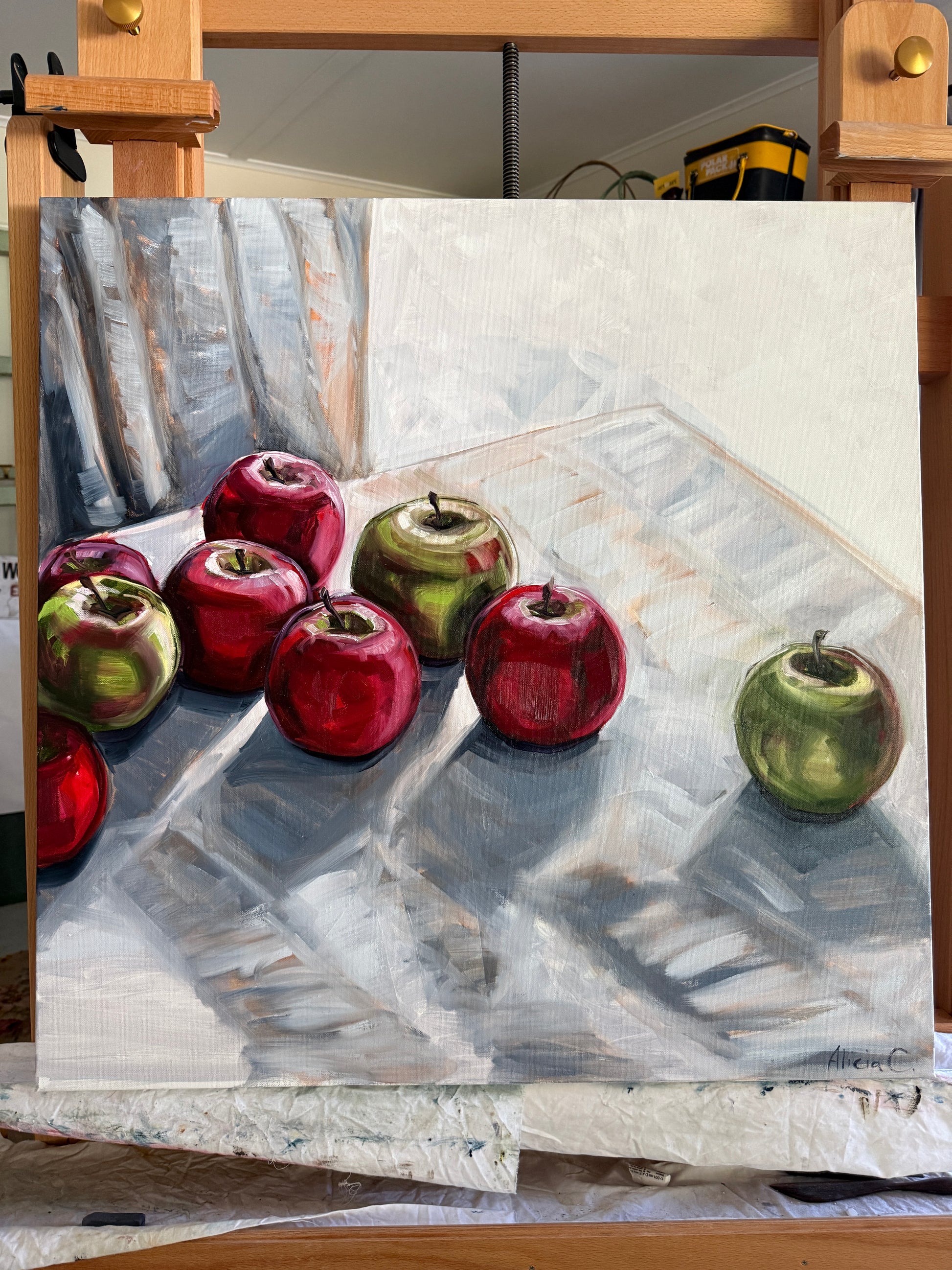 A study of fresh ripe summer apples and the shadows and light of the summer sun.
