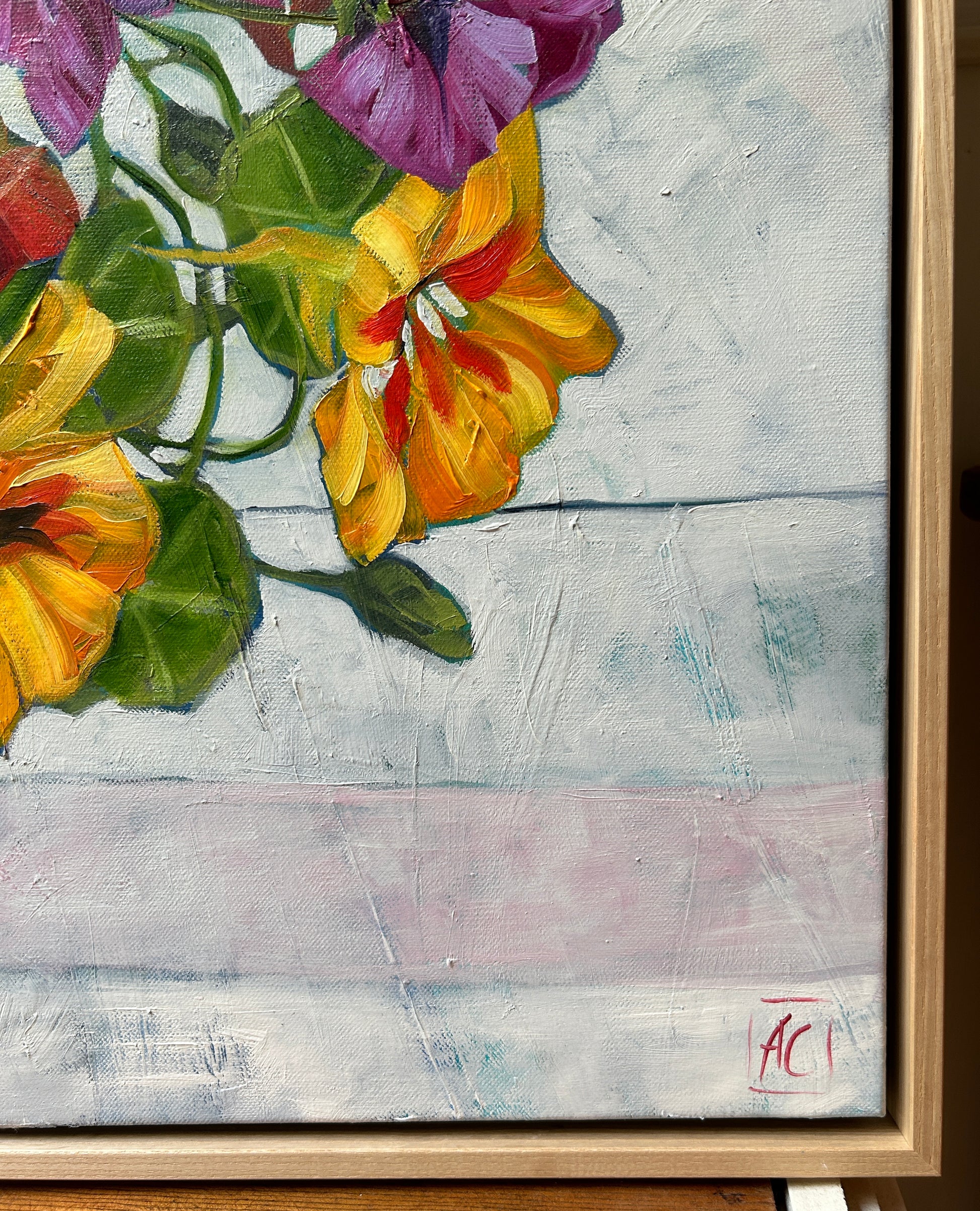 - This painting is on ARTIST quality stretched cotton duck canvas with internal wooden frame and Raw Oak external frame.