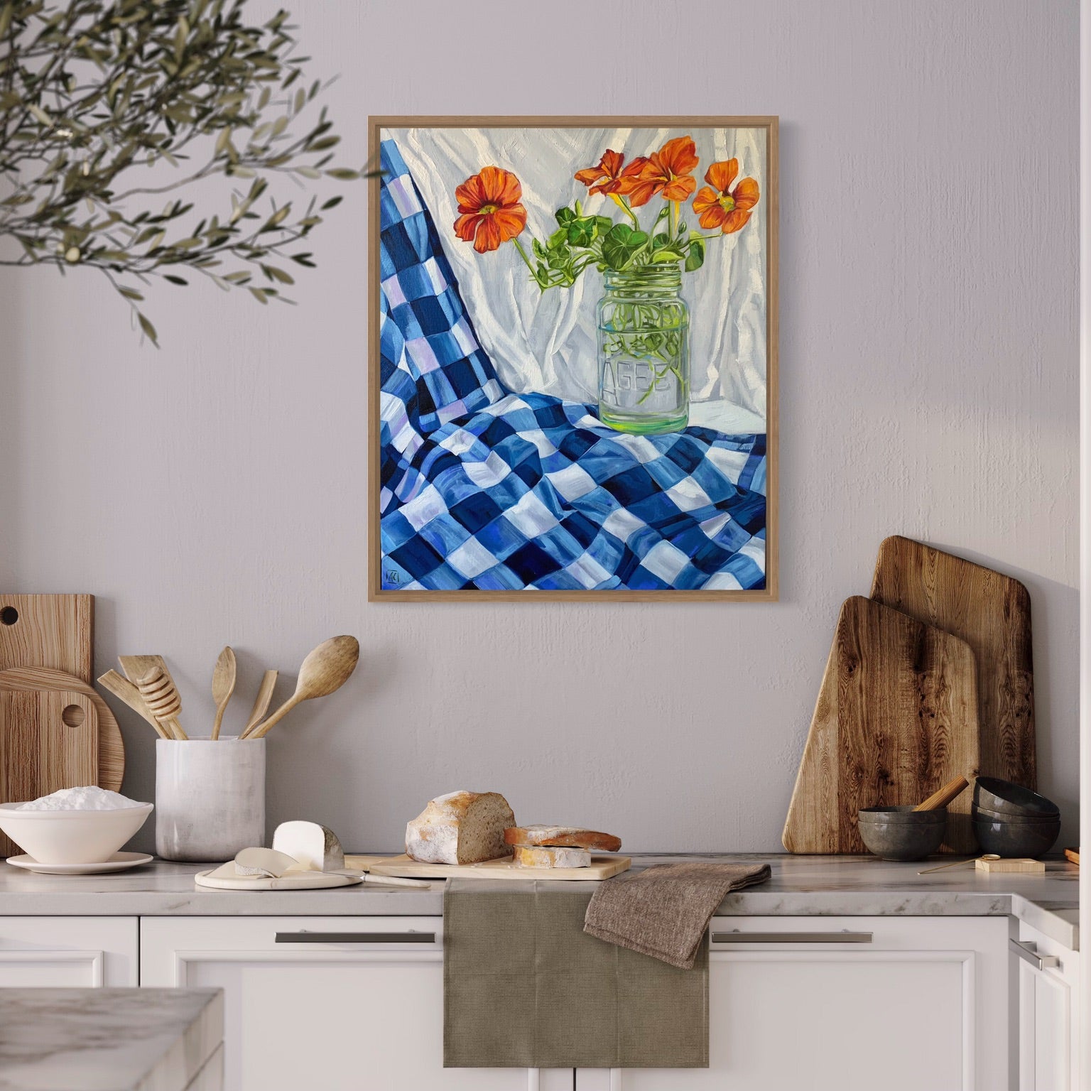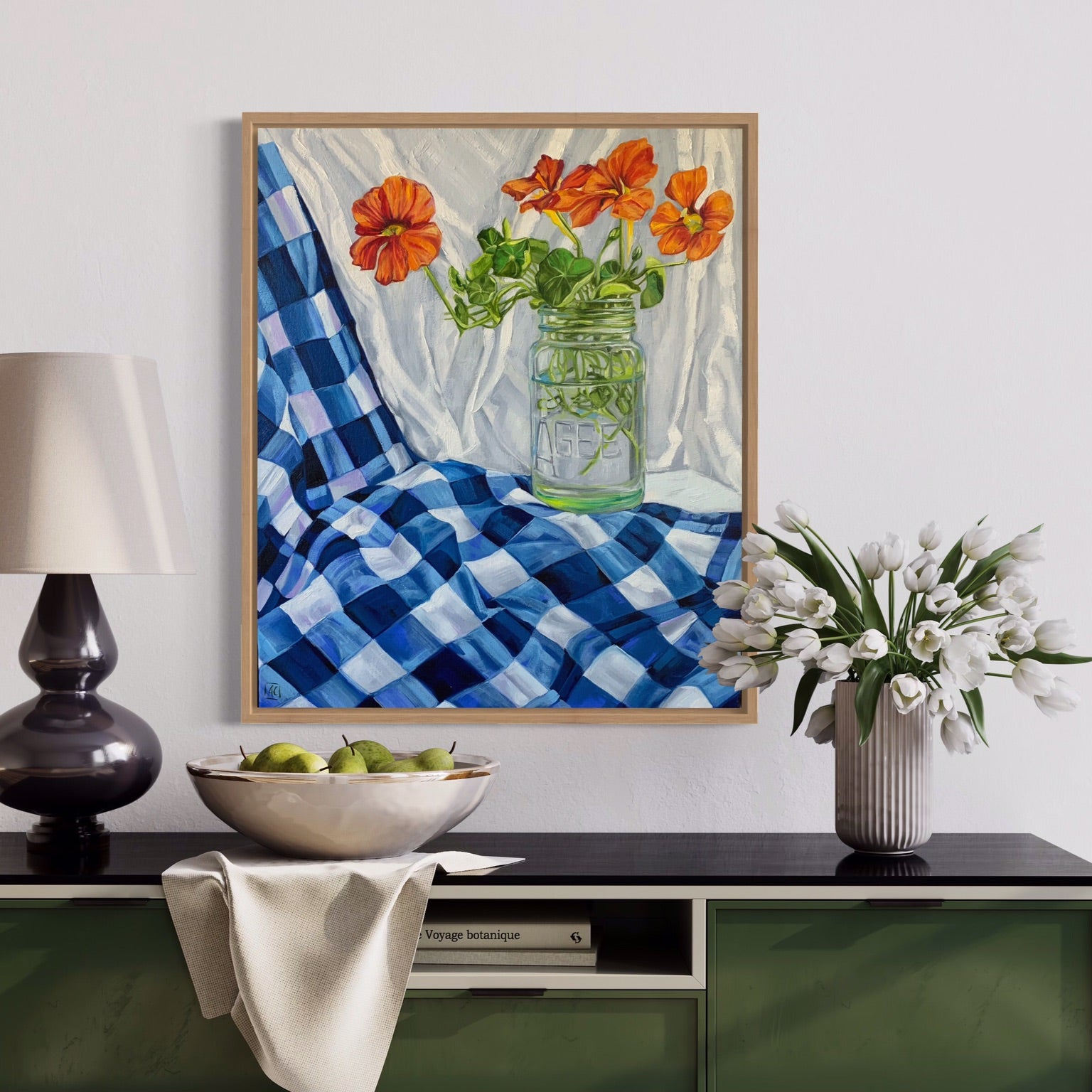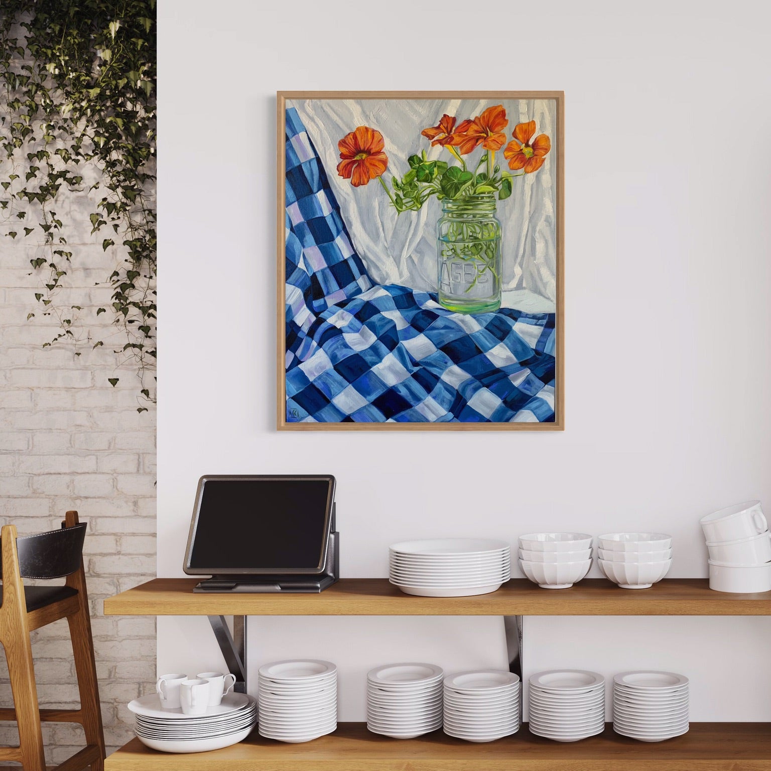 Picked from our mountain garden, a bunch of floppy nasturtiums placed in a 1930s AGEE fruit bottling jar on a vintage checked tablecloth