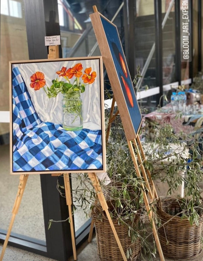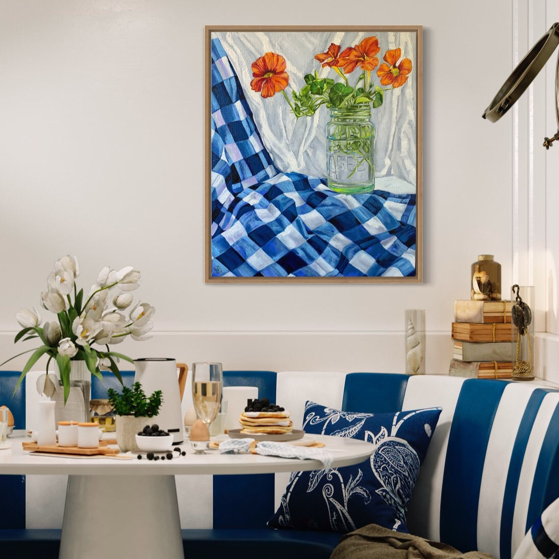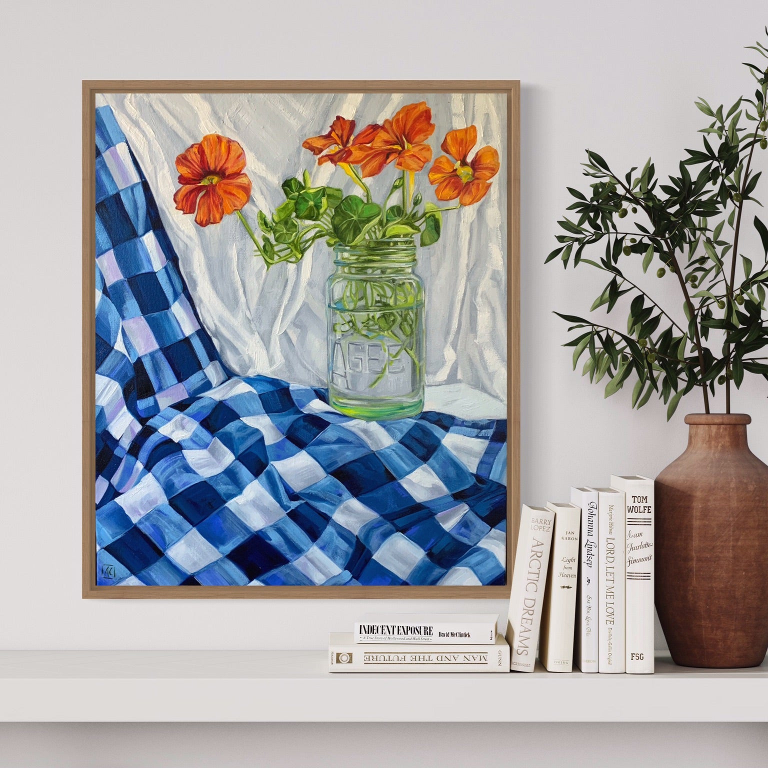 Picked from our mountain garden, a bunch of floppy nasturtiums placed in a 1930s AGEE fruit bottling jar on a vintage checked tablecloth
