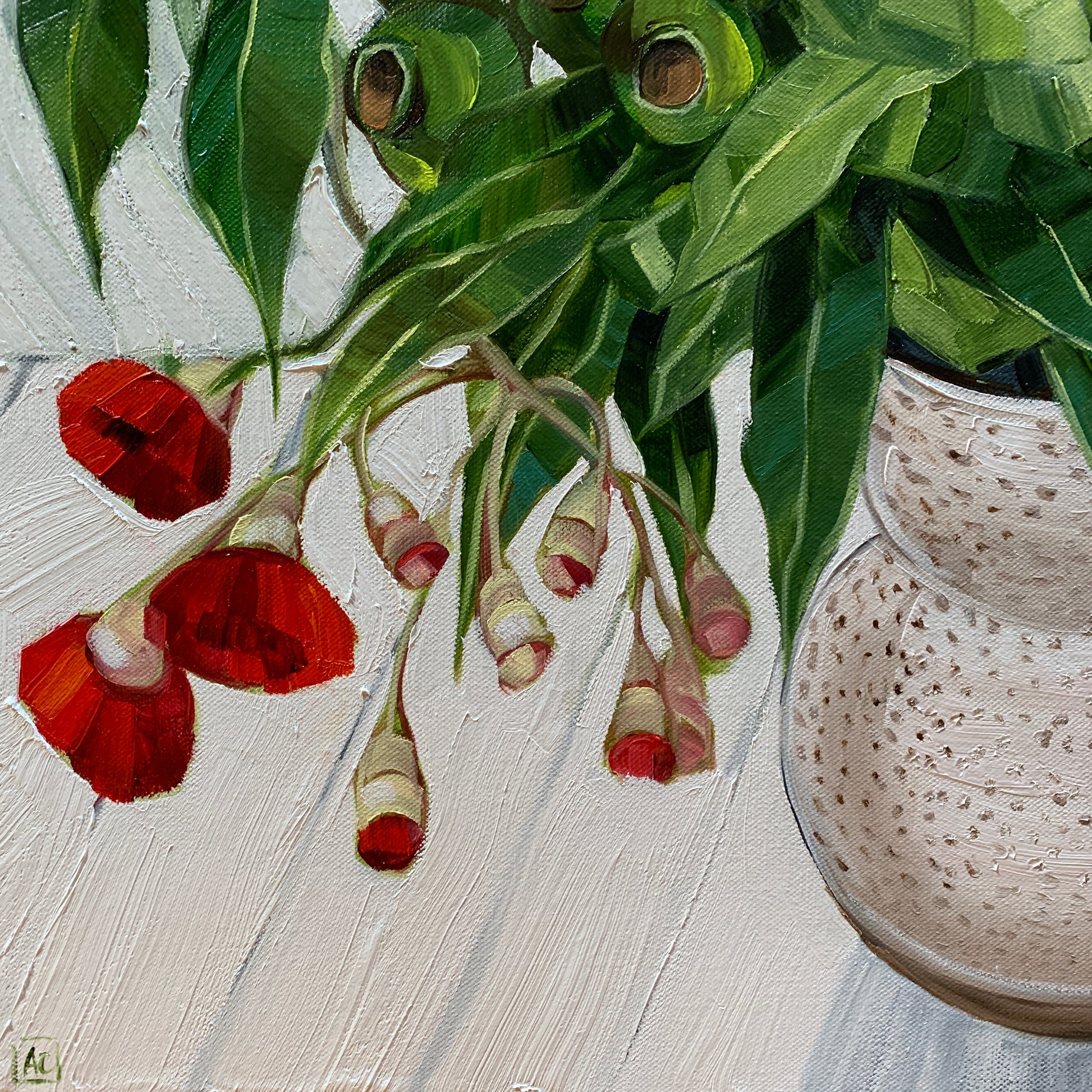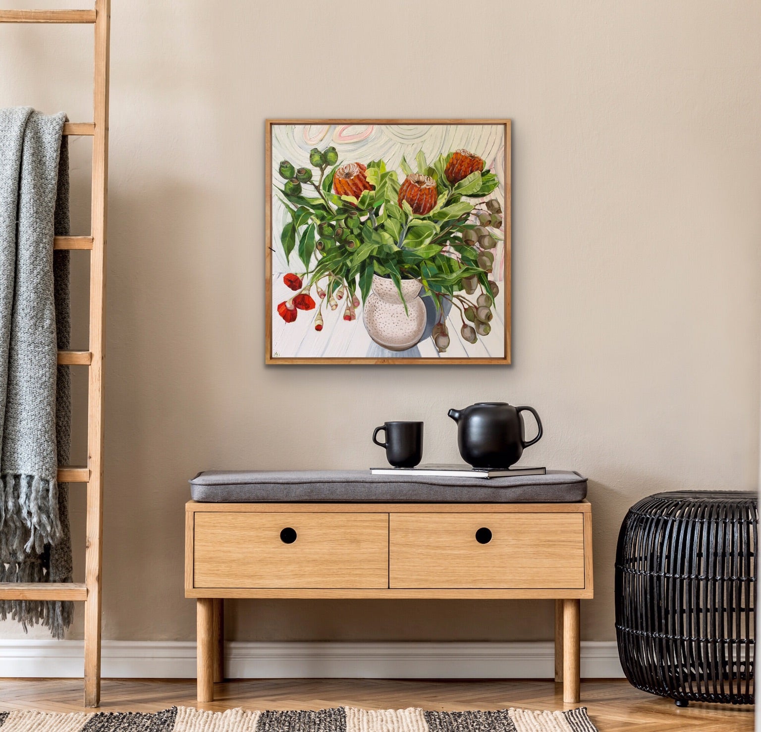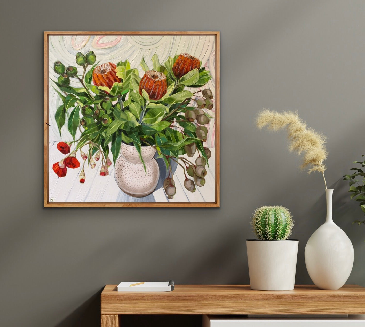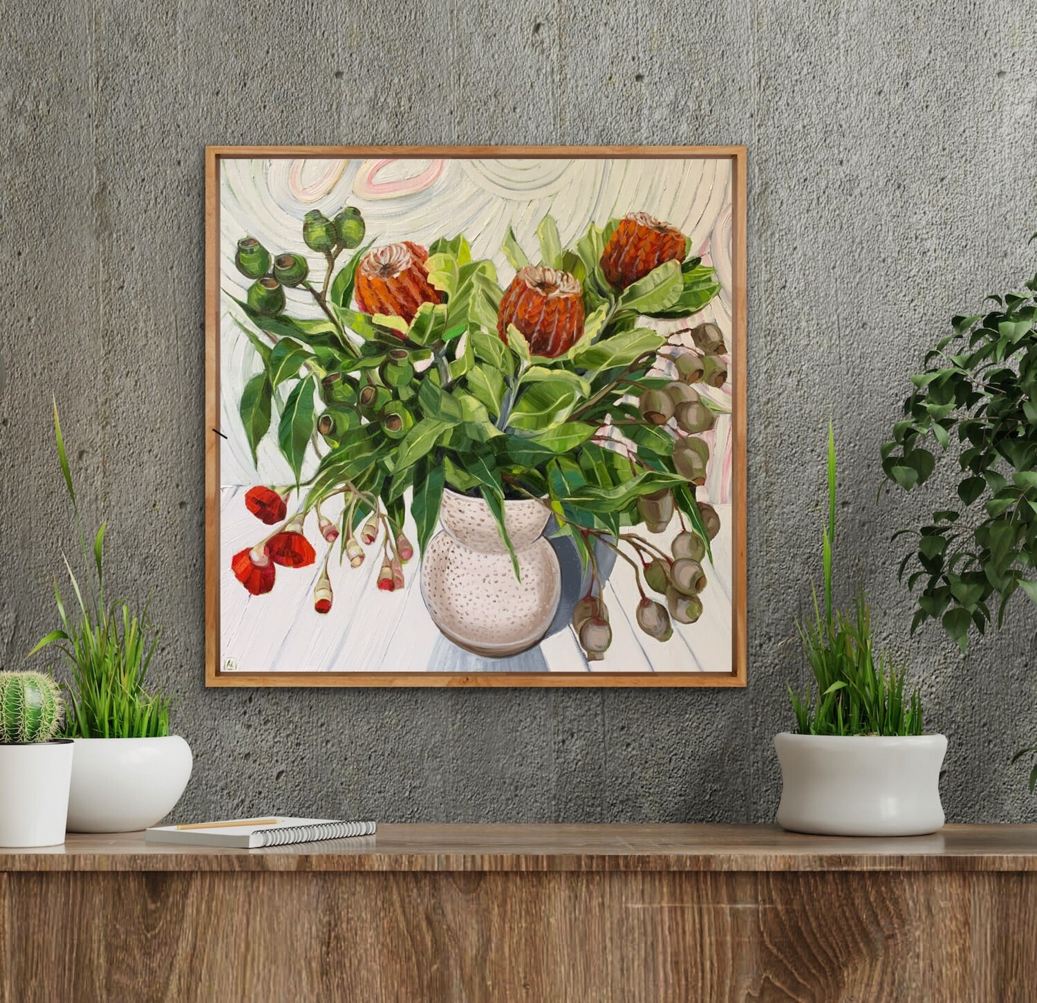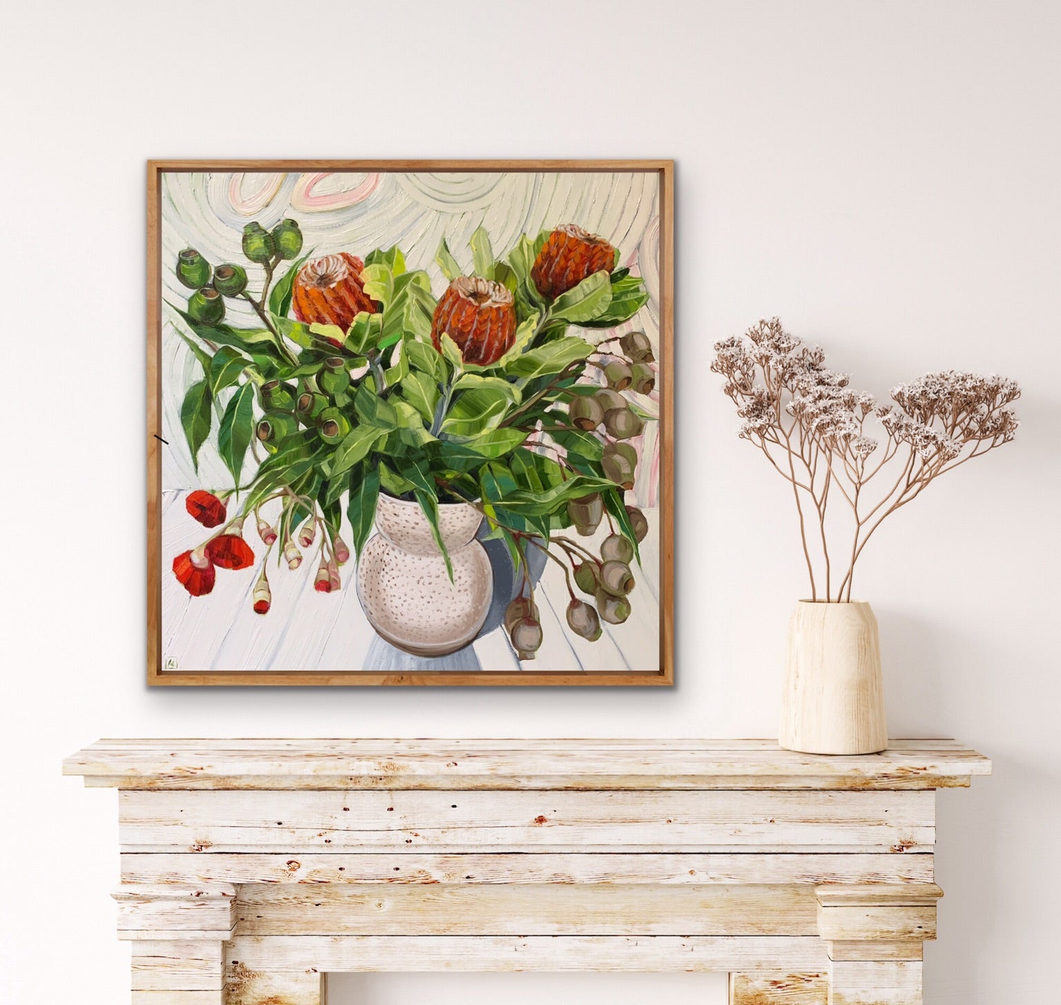 A new series working with gum nuts and leaves found on my hikes through the Yarra Ranges. The Waratah Banksia is a locally sourced native flower as is the red gum blossom.
