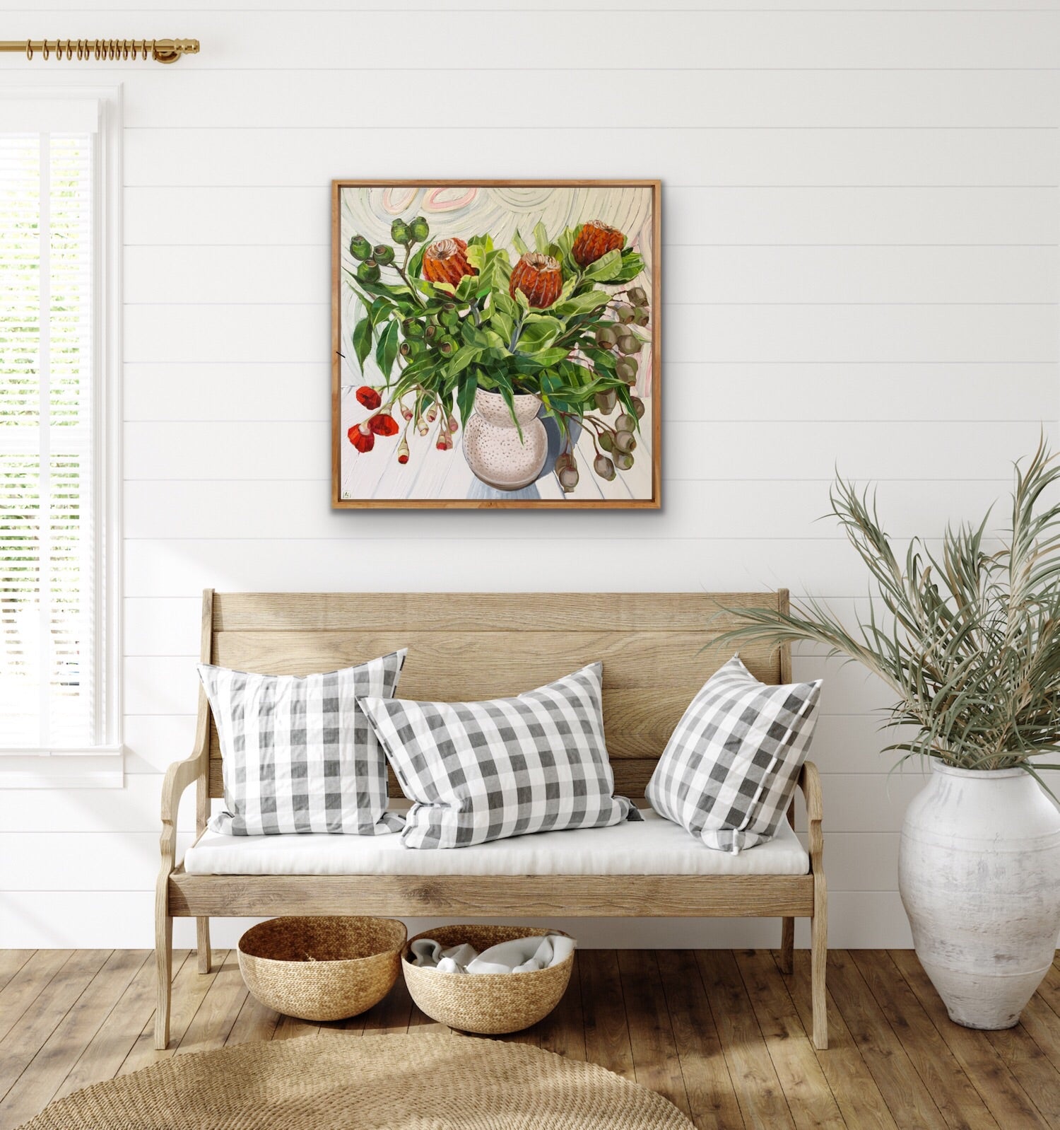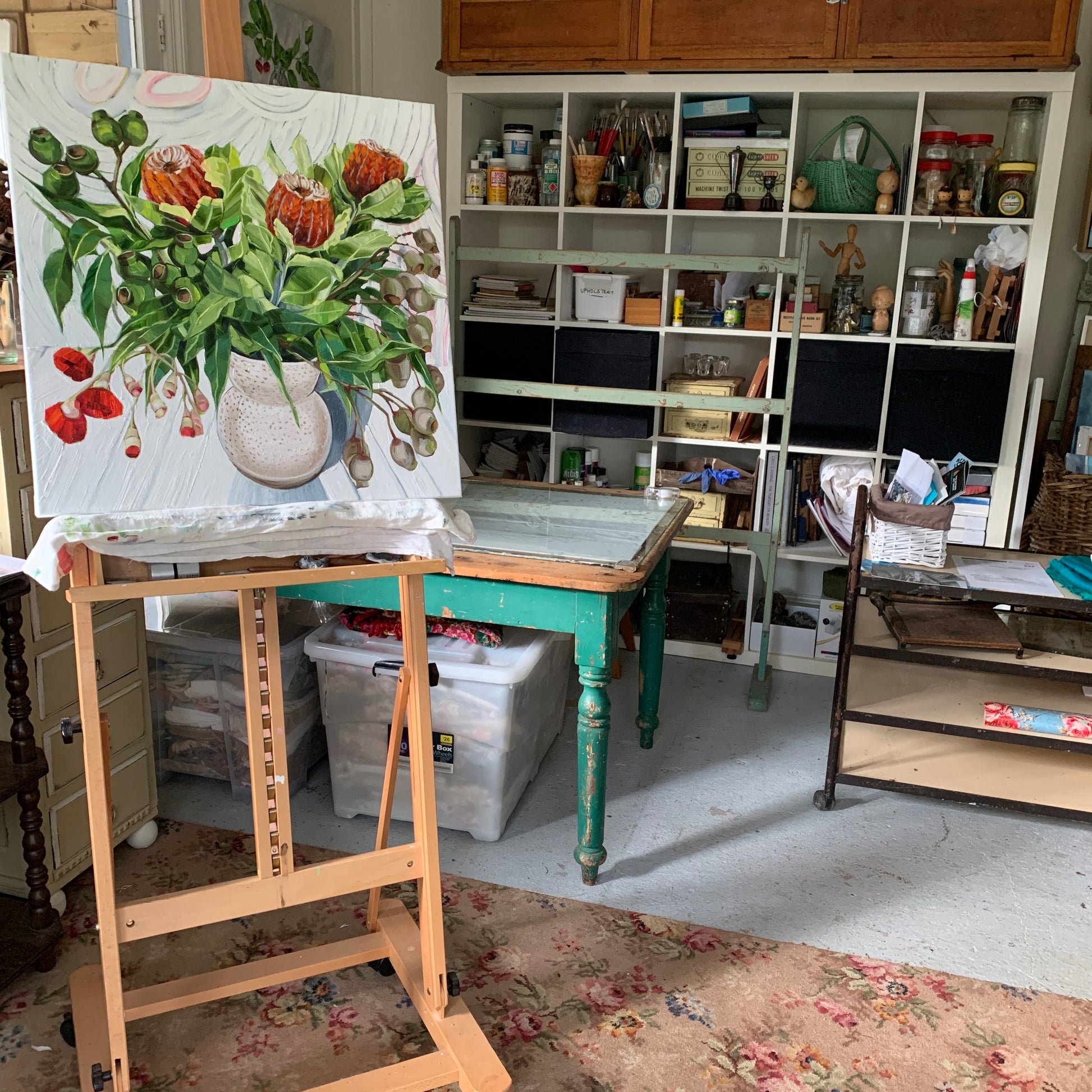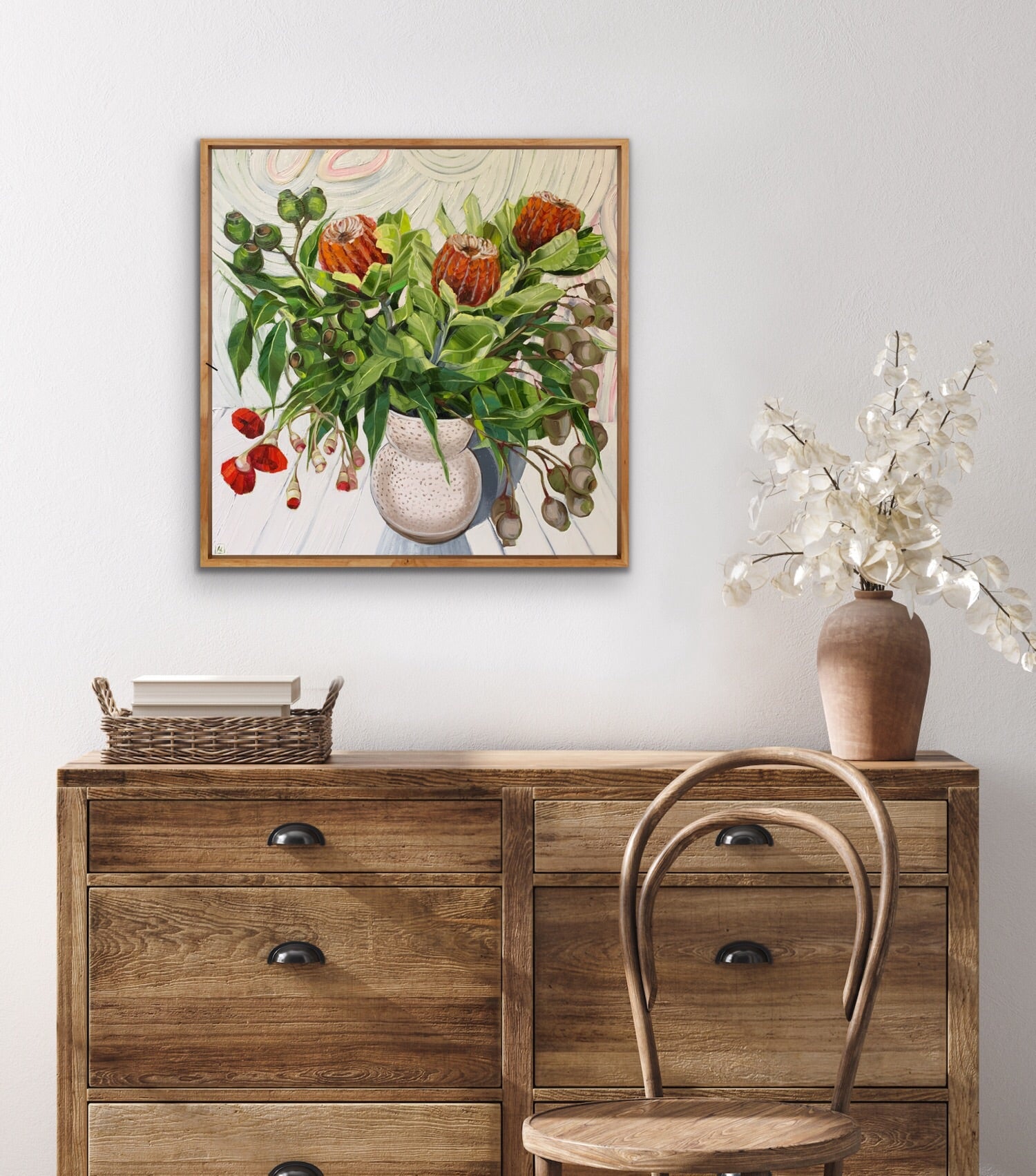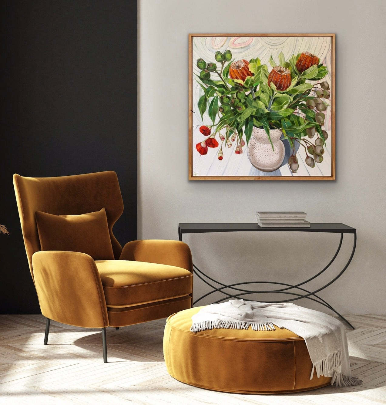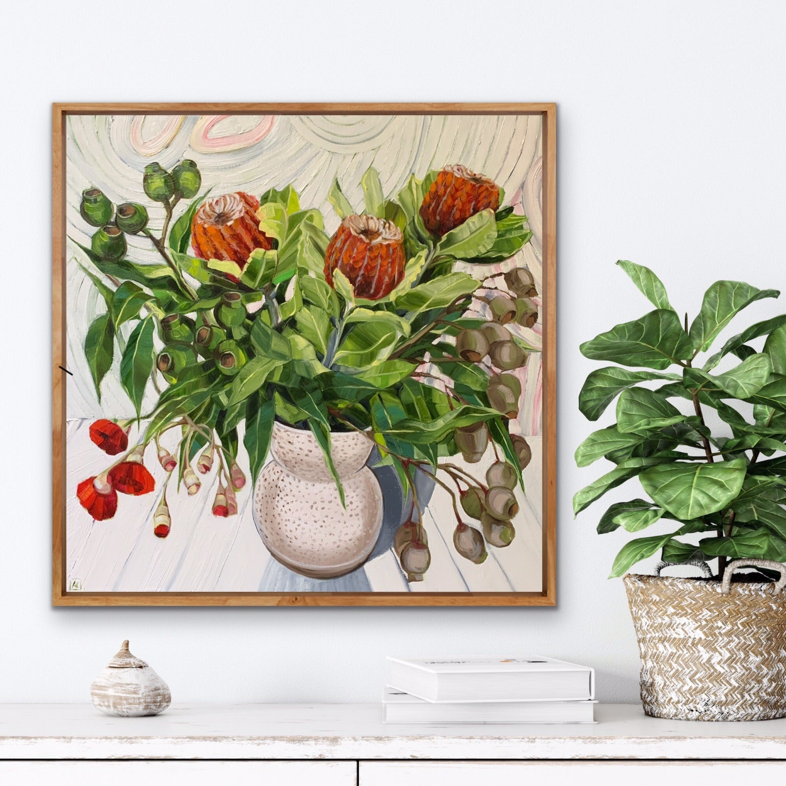 A new series working with gum nuts and leaves found on my hikes through the Yarra Ranges. The Waratah Banksia is a locally sourced native flower as is the red gum blossom.